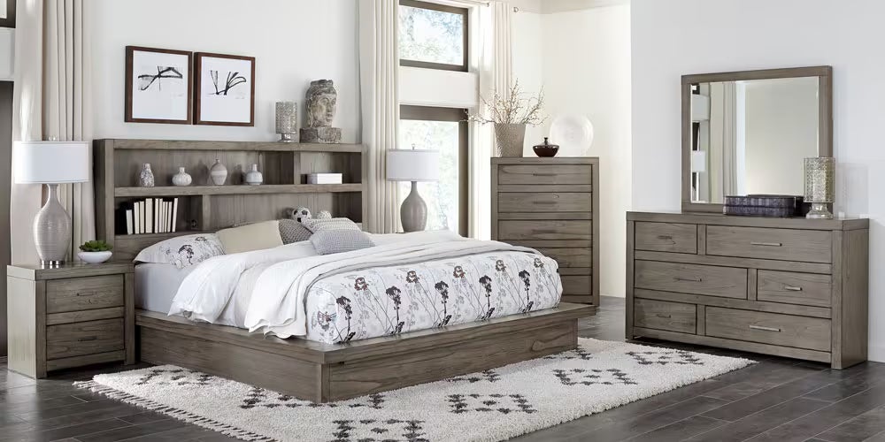 Simple and stylish, the Anoka bedroom is perfect for those looking for an organic contemporary style. The Greystone finish is applied over Mindi veneers to highlight the wood grain. Clean lines, thick moldings and antiqued bronze pull hardware create the collection’s signature style, while innovative and useful features make it uniquely practical.