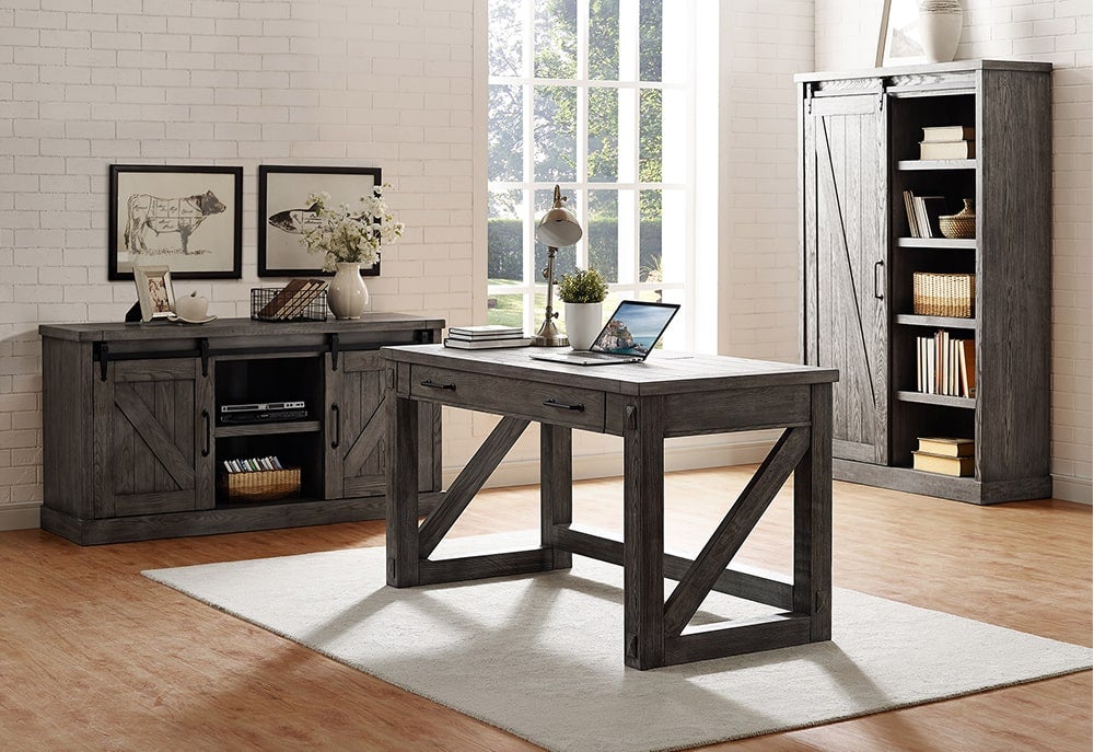 The Arona collection made of kiln-dried solid wood and veneers speaks to simplicity with its distressed wire brushed pine finish. Rustic details such as barn door hardware, heavy plank tops and timber legs highlight the age and beauty of this collection.