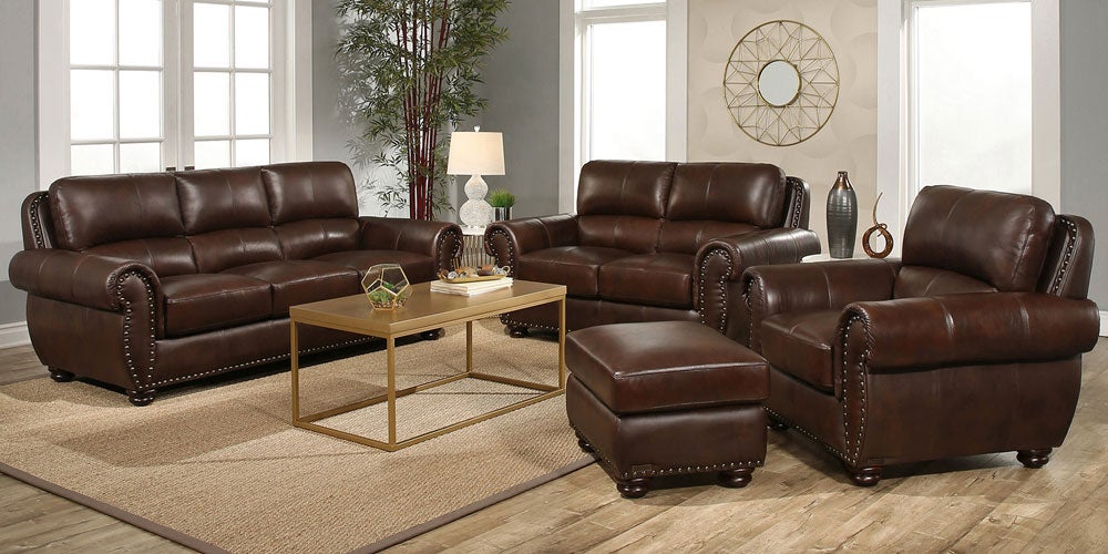 Crafted of durable dark brown top grain leather that is both soft and supple, the Austin set provides both comfort and elegance with its transitionally designed frame, complimented perfectly by its classic rolled armrests. It also offers several unique traits, such as the antiqued nail-head trimmings which are all individually placed by hand, adding a designer's touch. In large living rooms or casual family rooms, the Austin 4-piece Top Grain Leather Set invites you to a classy and comfortable space every single day.