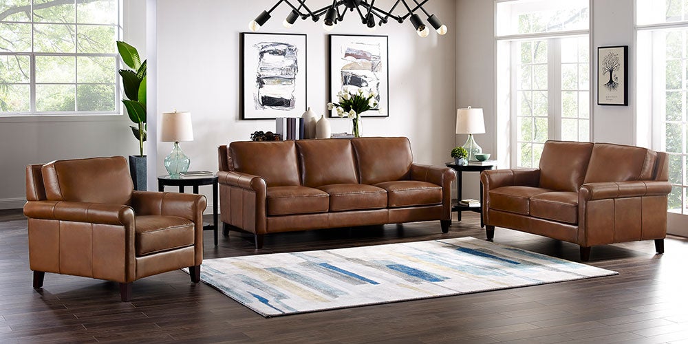 The Larsen Top Grain Leather Set will set the tone in your space without compromising on comfort. Effortless style and clean lines are the underlying theme for the understated chic design of the Larsen Set. The silhouette is highlighted with tailored box seat cushions, rolled arms and solid wood legs in Dark Brown finish. These subtle details turn the Larsen into a versatile, modern piece that works with any style.