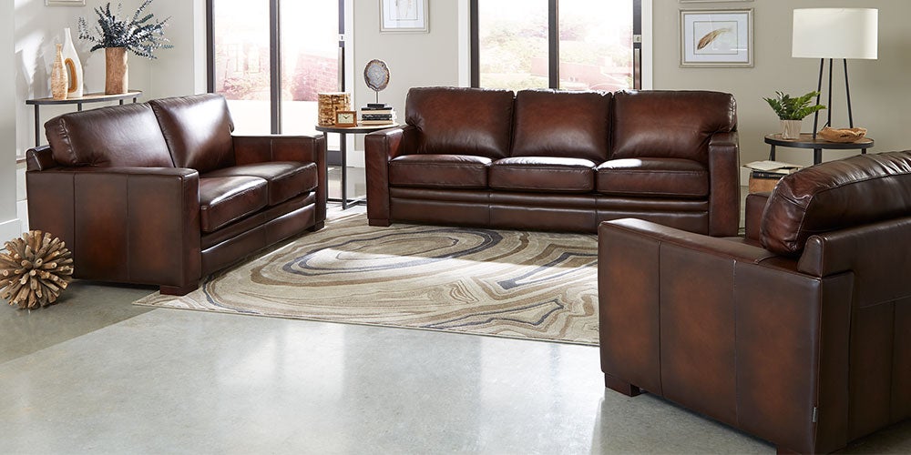 Streamlined and classic capture the essence of the 100% leather Luca Top Grain Leather Set. The straight lines of the silhouette, square track arms and solid wood feet gracefully set the stage for this timeless design. The Luca is covered in a dark Brown leather that has an exquisite hand-rubbed finish which gives it a rich burnished patina effect. This process ensures each piece in the collection is as unique as it is beautiful.