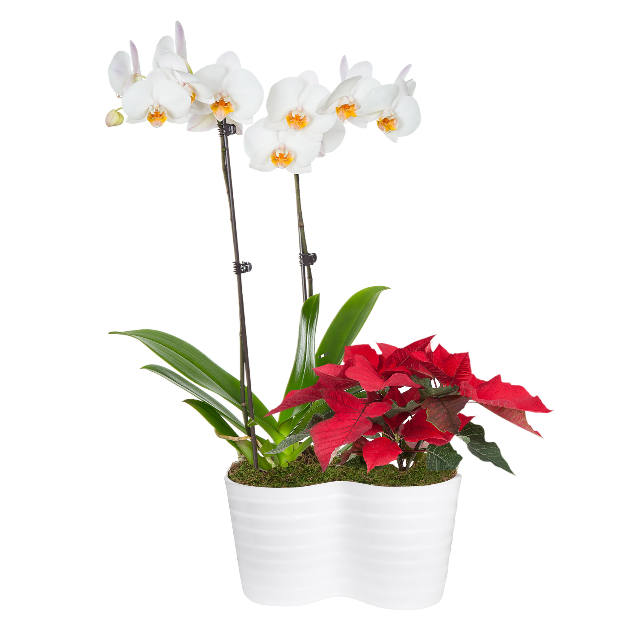 10” Duo with 5” White Orchid Yellow Center + 4” Red Poinsettia in Betty White Duo ContainerProduct Details: