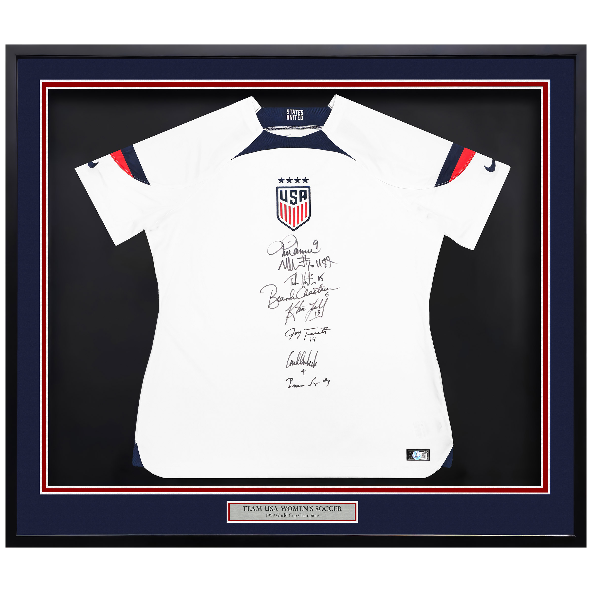 1999 World Cup Champion Team USA Women's Soccer Team Autographed Framed White Nike Jersey with 8 Signatures - Beckett Authenticated
