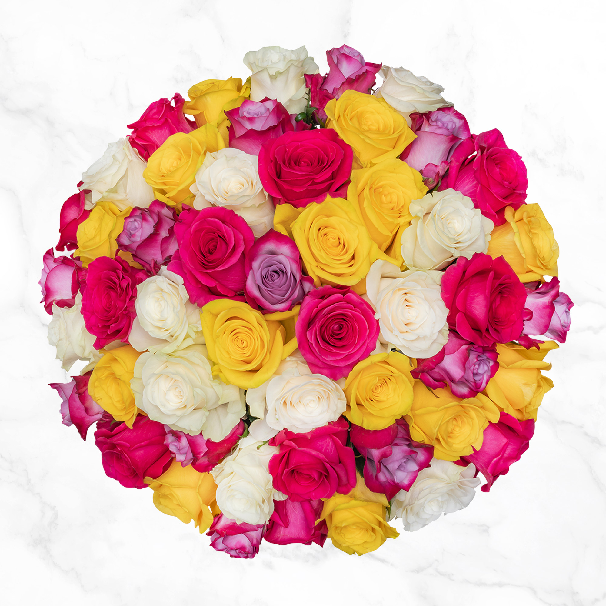 Stems Include: Roses Hot Pink, Roses Lavender, Roses White, Roses Yellow (50 Stems)