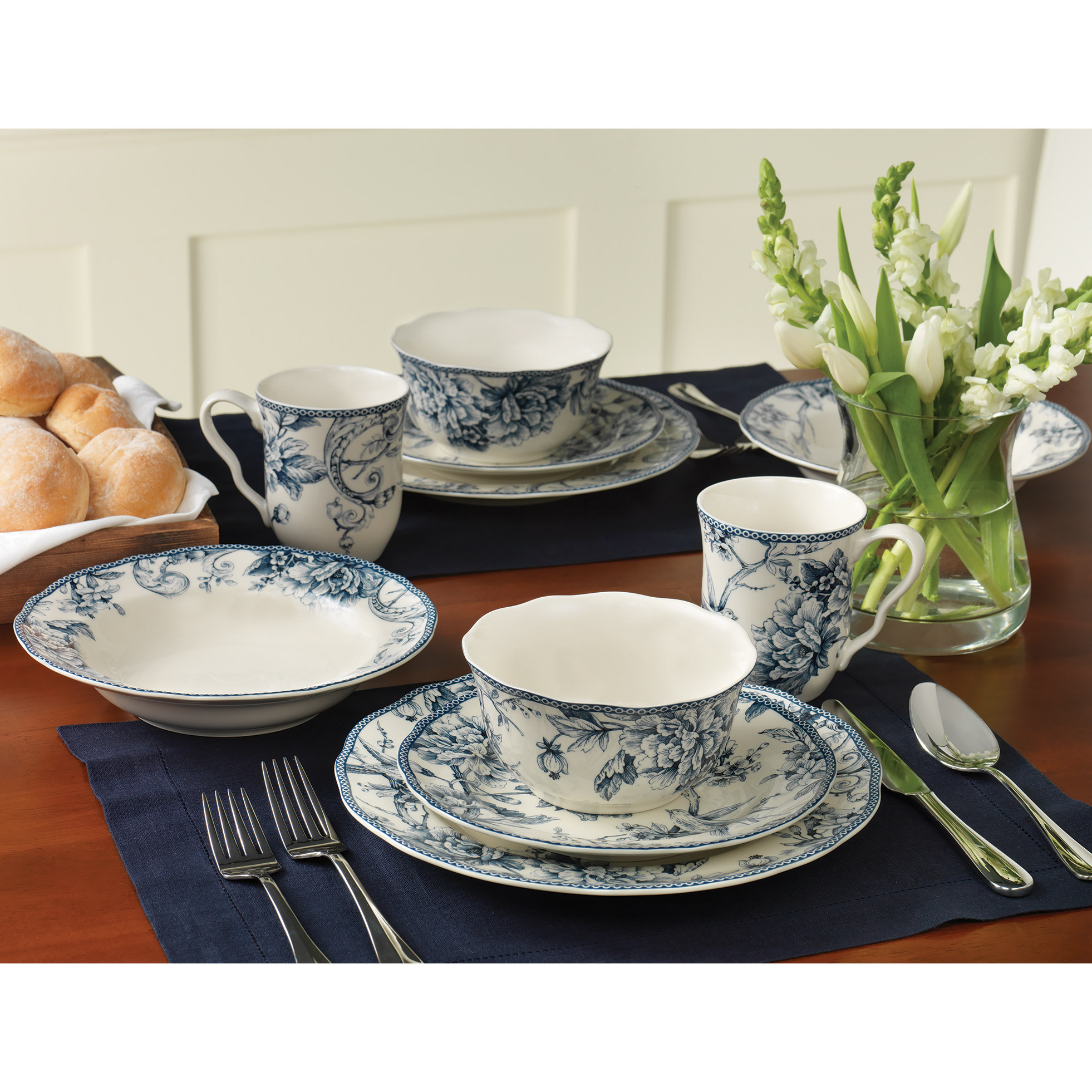 Meet the Adelaide Dinnerware Collection in blue, inspired by an 18th-century Toile de Jouy pattern. Fashioned from a creamy ivory porcelain with a hand-applied decal in rich blue, this dinnerware set features a romantic spring scene of birds singing among flowering branches in an intricate woodland tableau. Each piece is crafted from durable, chip-resistant porcelain. 20-piece Set Includes: