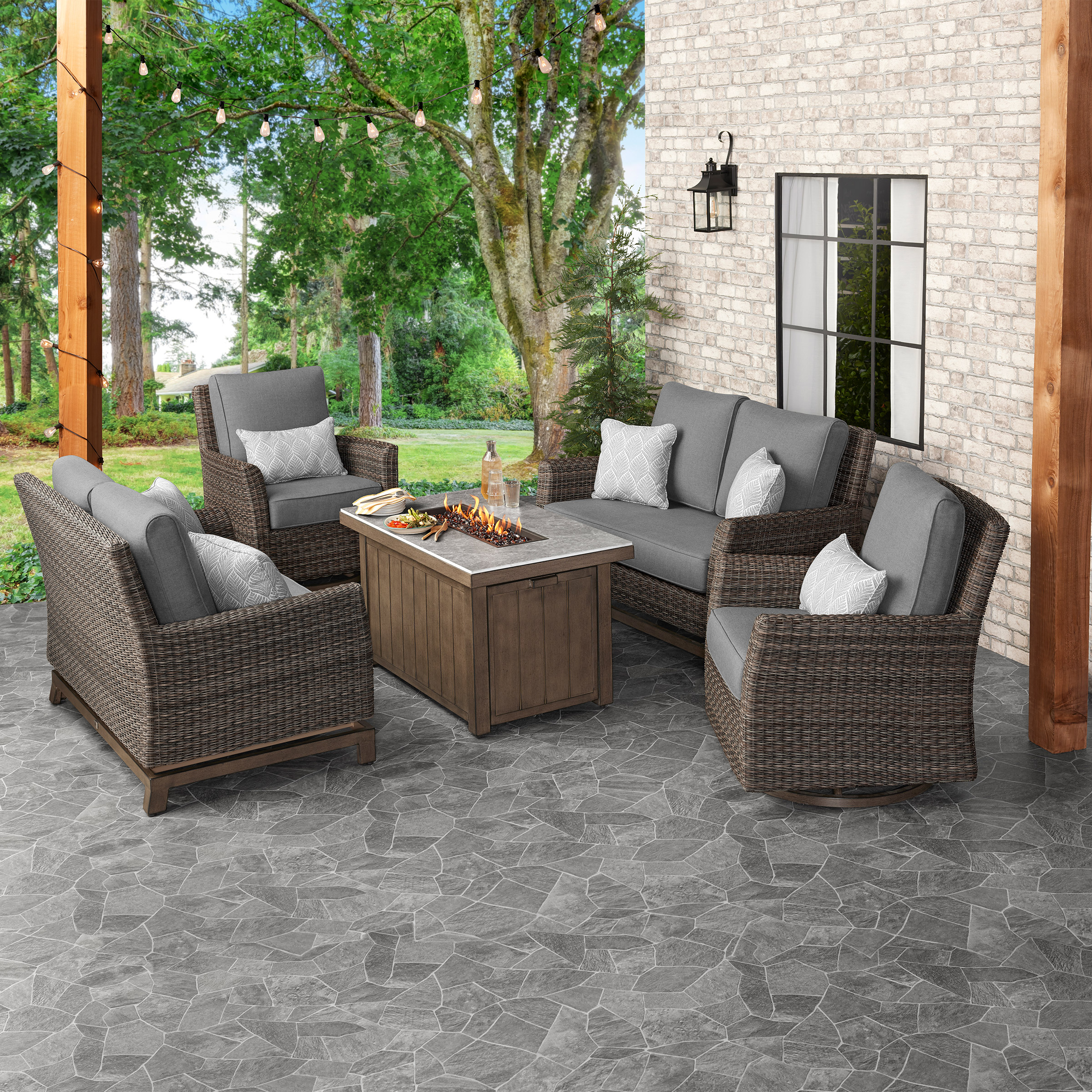 - 2 Swivel Chairs, 2 Glider Loveseats, 1 Fire Table, 6 Decor Pillows and Furniture Cover