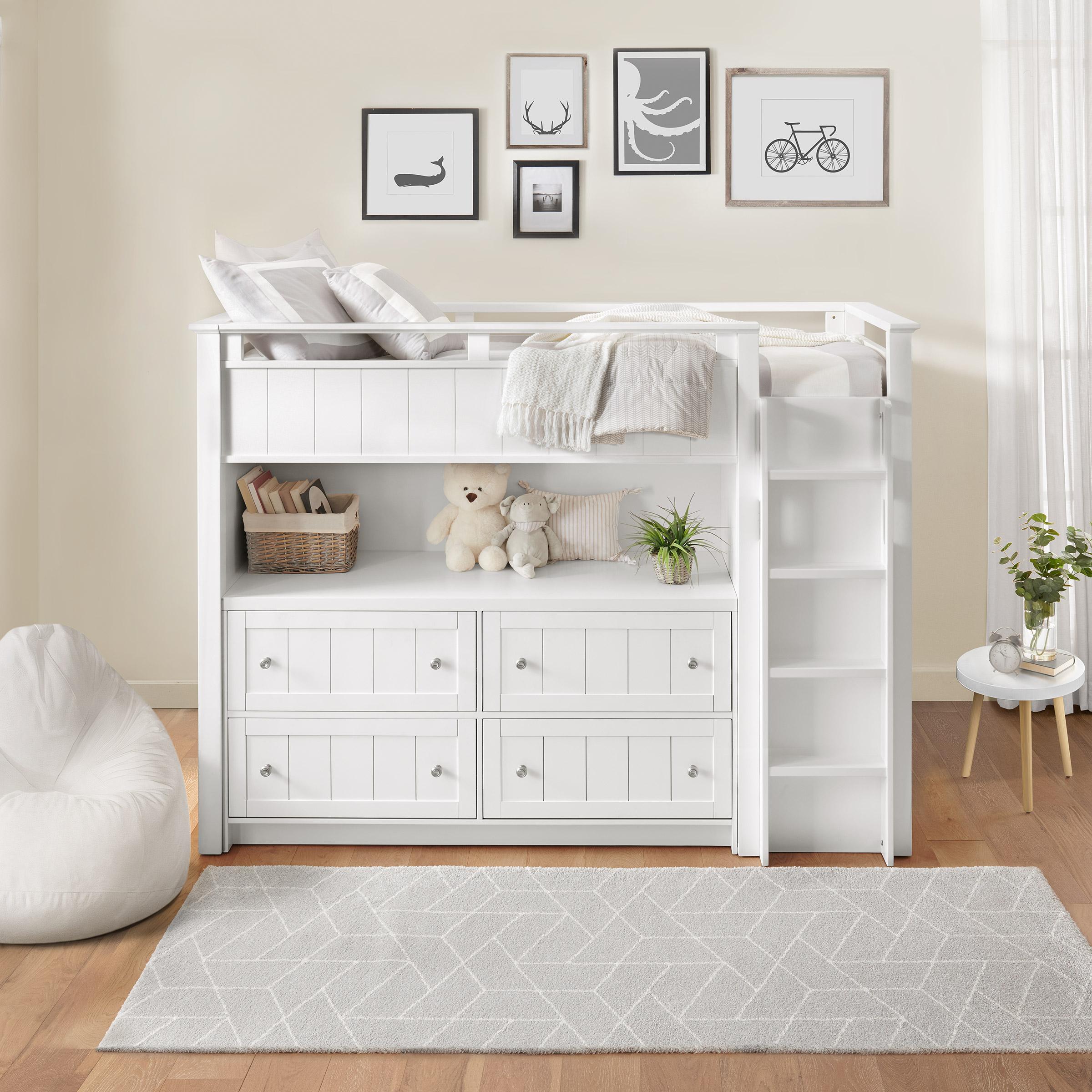 The Aiden Twin Bed Loft by Bayside Furnishings creates an especially sweet space for your little one. Compact and cozy, it comes complete with a built-in, four-drawer dresser and storage cubby space for plenty of space for clothes, toys, and books. Plus it fits a standard twin size mattress and a ladder with safety rails, so your kiddo can comfortably and securely lay his or her head down at night. A fully enclosed back panel keeps your little ones safe.