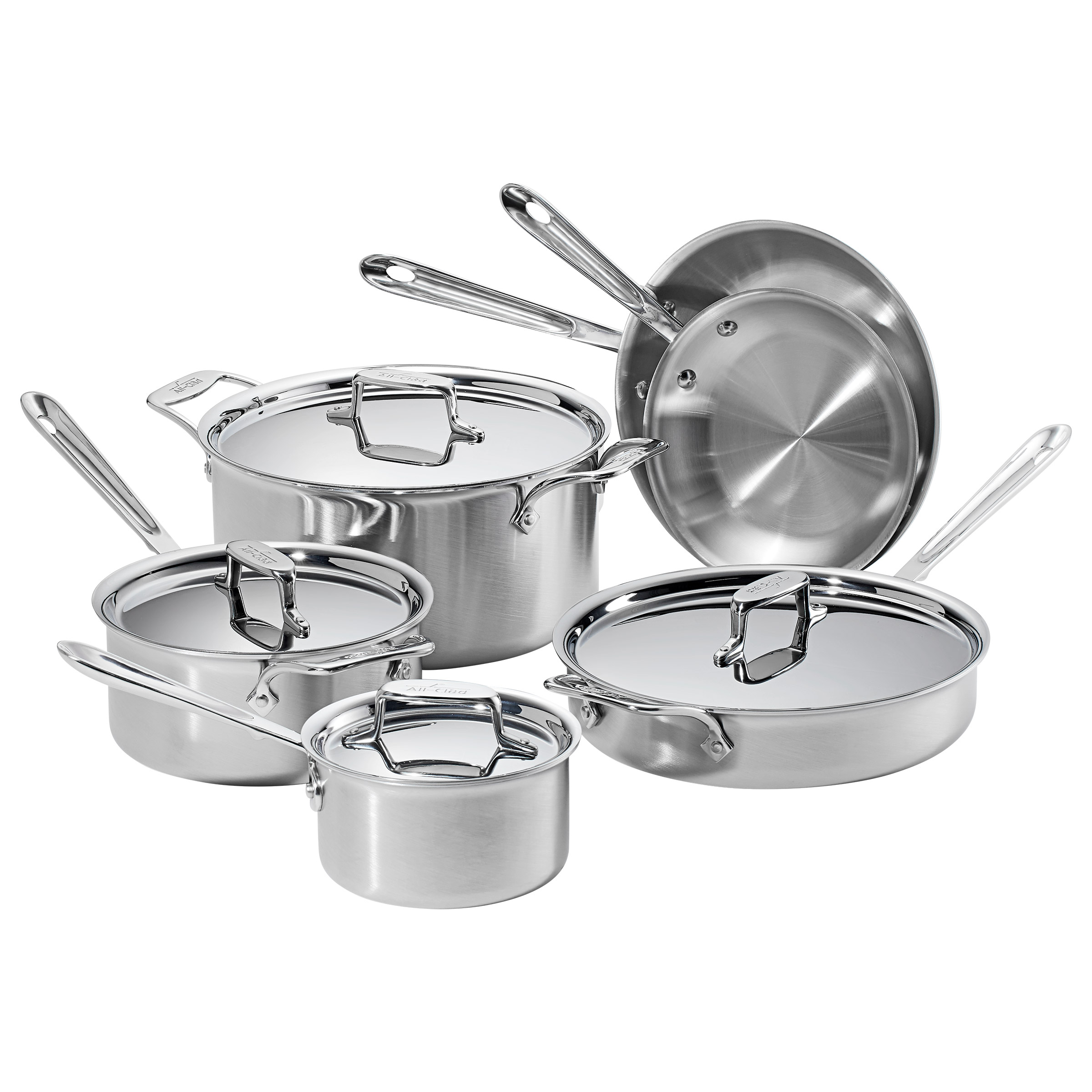 The All-Clad D5 Brushed Stainless Steel Cookware Set features 5 layers of alternating aluminum and stainless steel to provide a superior cooking experience. With its elegant look and natural resistance to having foods stick to its surface, this beautiful, durable cookware set will satisfy the needs of even the most discerning chef and provide a lifetime of high performance meal preparation.