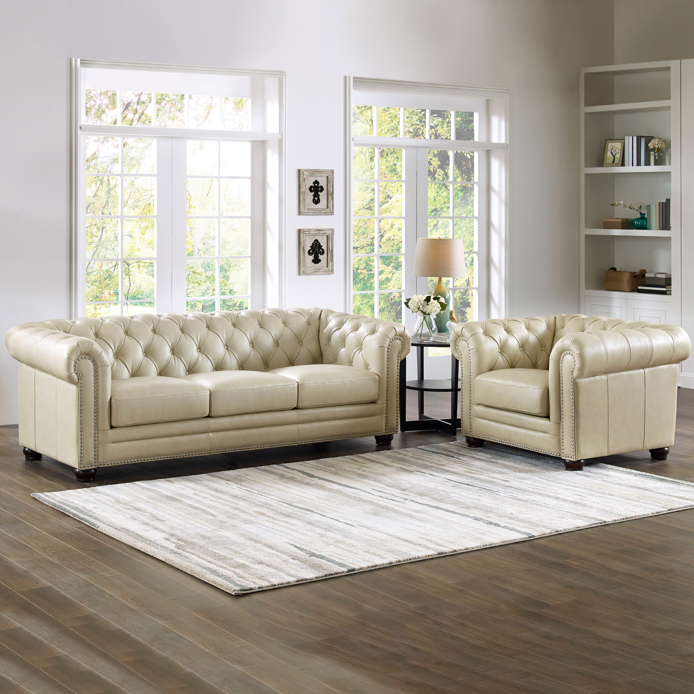 The Allington 2-piece Top Grain Leather Set features stunning button-tufted back cushions, accentuated by beautiful padded and tufted high rolled arms and solid wood bun feet.  The stately Pewter nail-head trim is hand applied and intricately outlines the arms and front rails, adding the perfect finishing touch to this exquisite piece. The Allington 2-piece Top Grain Leather Set has generous seating for your guests and is constructed to stand the test of time. The Eggshell White color leather has undertones that give the leather a slightly different color appearance, depending on the amount of natural light and type of lighting in the room; as well as the primary colors of the collections surroundings. The color can migrate from White, to Beige, to slight Gray depending on environment. Please use the link provided below to request a leather swatch, insuring the leather color is exactly what you are envisioning. The leather swatch will also demonstrate the quality and feel of the leather. Each piece is handmade by skilled craftsmen using a kiln-dried solid wood frame. The Allington is covered in soft, supple Top Grain Leather on all seating areas and arms rests with split grain leather on the front rail, sides and back.  A combination of seat cushions and no sag seat springs provide a balanced weight distribution for maximum durability and lasting comfort.  The pocketed-coil spring seat cushions feature separate springs that are individually wrapped in a fabric encasement, allowing each pocketed spring to move independently of the others.  The pocket coil seat springs are encased in a 2.25 lbs density high resiliency foam.  For added comfort and support, each cushion is double-wrapped with hollow fill fiber and down feathers. The premium seat cushions are removable and rest on a no-sag spring platform ensuring the support and comfort you desire.   Please email swatch@prosperahome.com to receive a sample swatch. Please include your name, address, phone number and the item description that corresponds with your selection. Includes: Sofa and Chair Features: