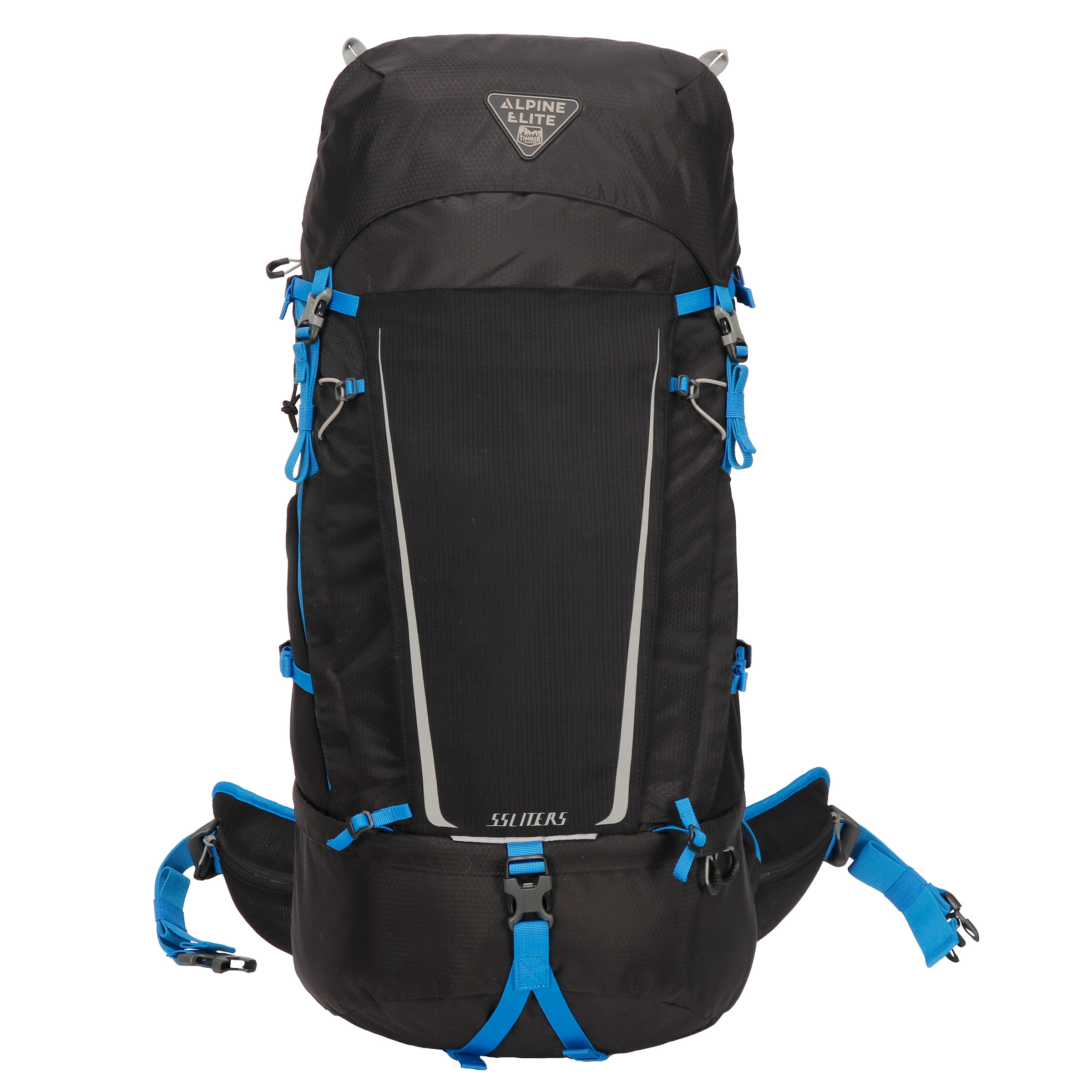 The Alpine Elite by Timber Ridge® 55 Liter Hiking Pack is constructed with lightweight 420D nylon fabric and durable YKK zippers for lasting performance on outdoor adventures. Enjoy maximum comfort with its ultra-padded back panel and adjustable torso. This pack will also help you stay organized with interior organization pockets and stretch mesh shove pockets for quick access to important items. Plus, it includes a two-liter reservoir, rain cover, and reflective accents for added safety.
