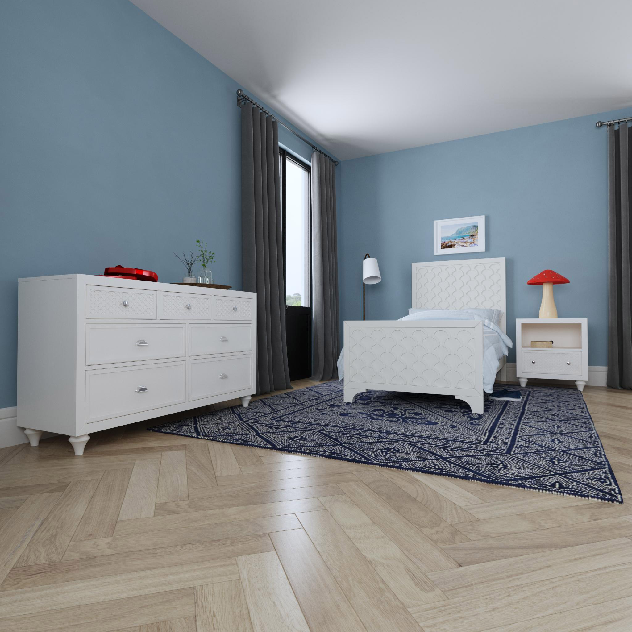 WARNING: This product can expose you to formaldehyde, which is known to the State of California to cause cancer and birth defects or other reproductive harm. For more information go to: www.P65Warnings.ca.gov.The Amanda Collection features classic coastal casual influences and styling updated in an elegant creamy white finish. The dresser and nightstand are produced with all wood drawers, English dovetail construction and feature full extension metal drawer glides for smooth opening and closing. Shown with polished nickel drawer pull, this collection meets or exceeds all current CPSC government safety standards. The 3pc Amanda full or twin bed collection features a shell motif design with picture frame moldings, two (2) drawer nightstand and seven (7) drawer dresser.