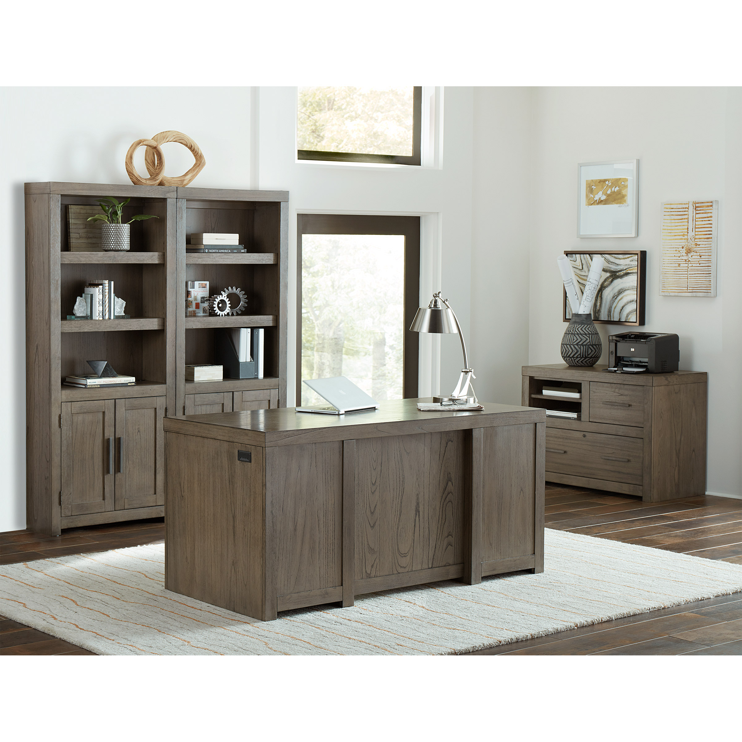 Limit 5 per member. Simple and stylish, the Anoka office collection is a perfect for those looking for an organic contemporary style.  The Greystone finish is applied over Mindi veneers to highlight the wood grain. Clean lines, thick moldings and antiqued bronze pull hardware create the collection’s signature style, while innovative and useful features make it uniquely practical.Set Includes: Executive desk, file cabinet and bookcase66” Executive Desk: