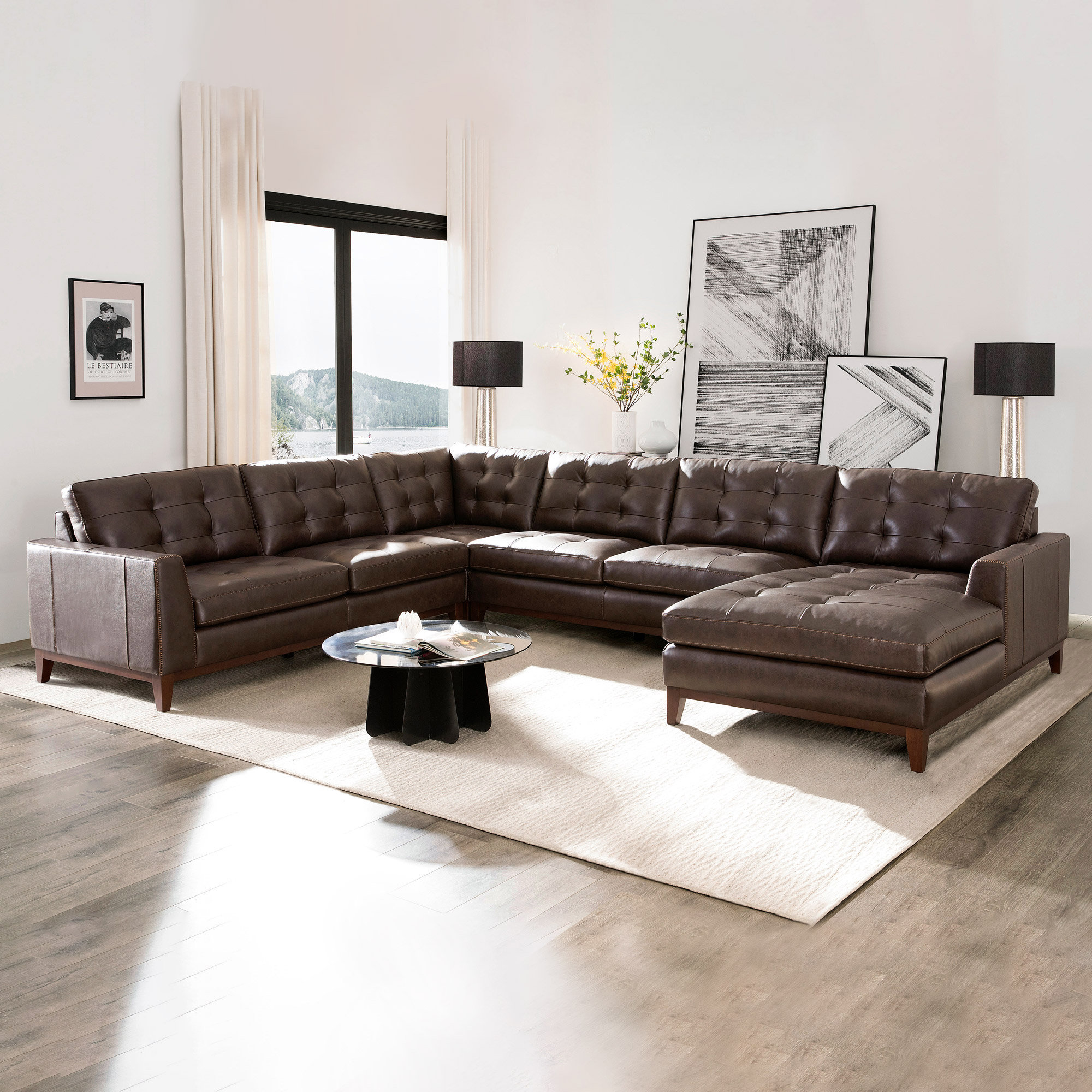 The Aquarius Leather Sectional offers spacious seating and comfort. The Aquarius Leather Sectional provides family-friendly seating for 6 people. The Aquarius is covered in a soft and durable brown colored leather. The Aquarius features a solid wood accent base in a rich brown finish adding to the look and style of the sectional. Also features a large and comfortable right side facing chaise.