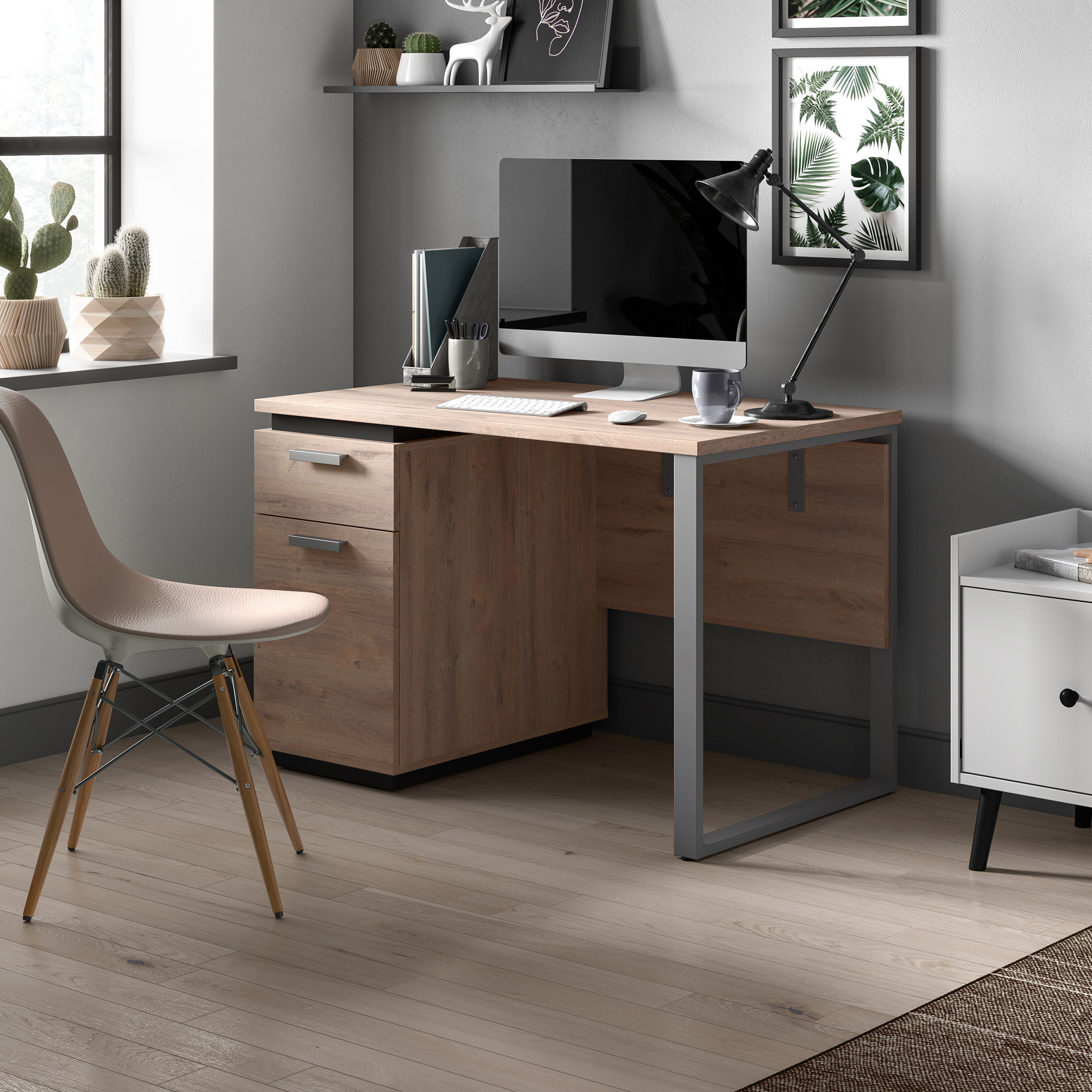- Layered desktop design, U-shaped steel leg, and aluminum handles create a modern look