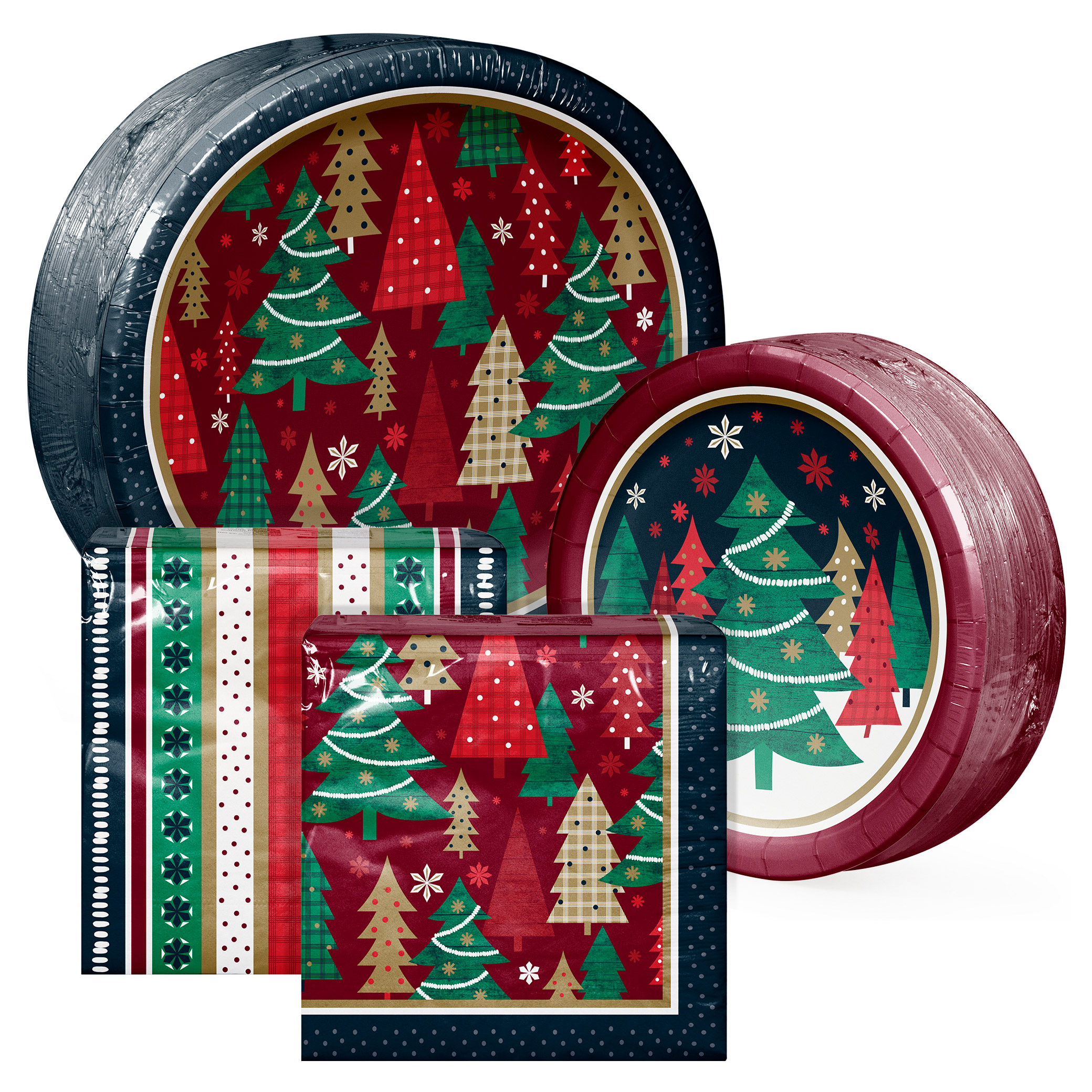 Bring festive charm to your holiday gatherings with the beautifully coordinated Festive Forest 200 Count Party Supplies Kit. This tableware kit consists of 50 Festive Forest oval dinner plates, 50 Festive Forest paper side plates, and 100 Festive Forest napkins! Featuring a whimsical forest of Christmas trees in rich shades of red, green, gold, and navy, each piece is adorned with a mix of plaid, polka dots, and classic holiday patterns. The oval paper plates and dessert paper plates showcase layered tree designs accented by snowflakes, while the matching paper napkins tie it all together with bold seasonal stripes and a coordinating tree print. Perfect for adding warmth and cheer to your Christmas celebrations, this set combines rustic charm with a classic holiday palette. Each kit comfortably serves 50 guests - order your kits today and prepare to host a charming holiday feast.