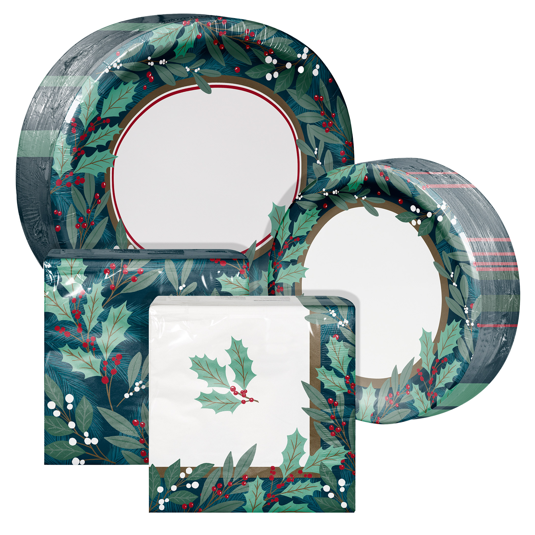 • Each kit contains 50 Holiday Greens oval dinner plates, 50 Holiday Greens paper dessert or appetizer plates, and 100 Holiday Greens napkins