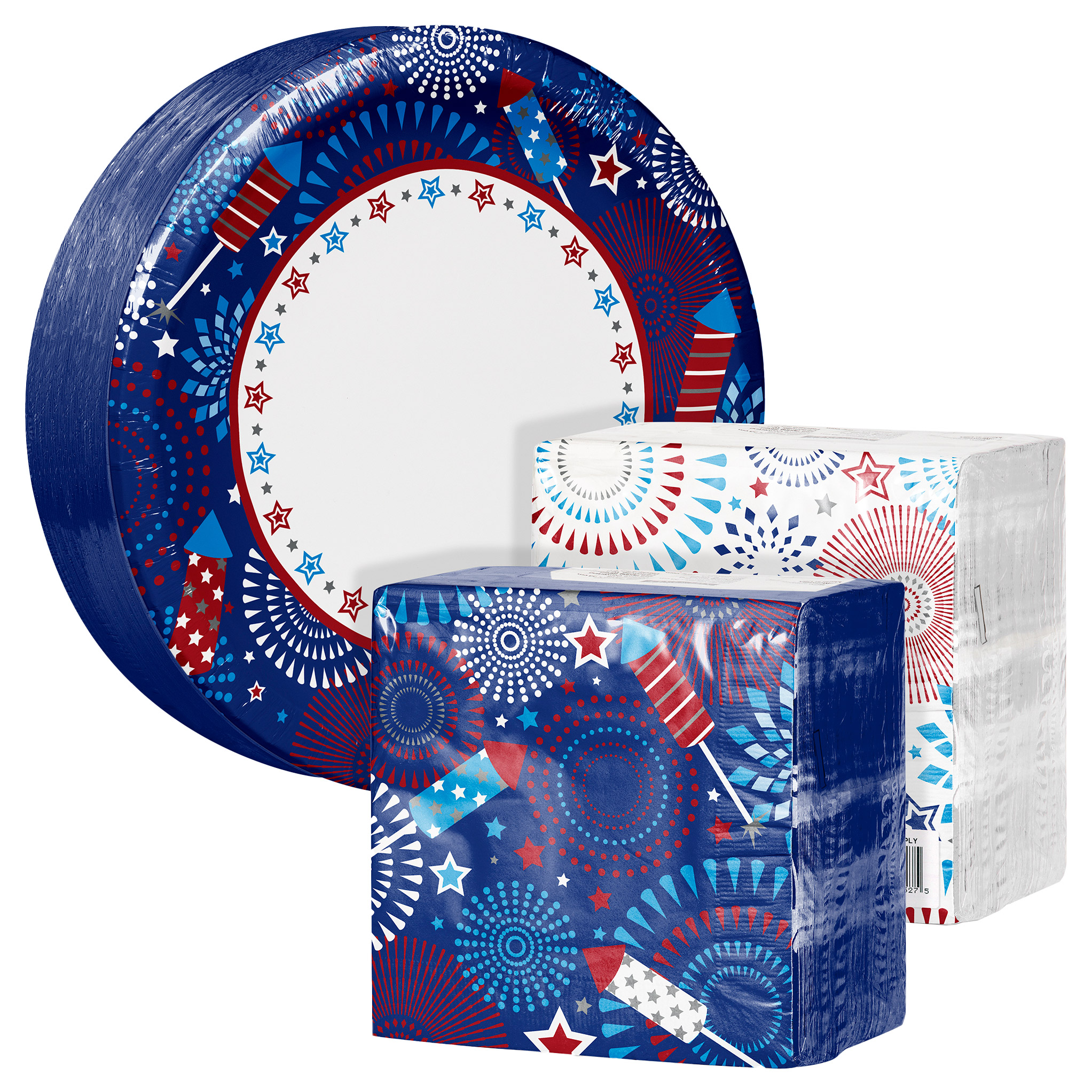 - Firecracker Fun Patriotic Plates and Napkins Kit serves 100 Guests