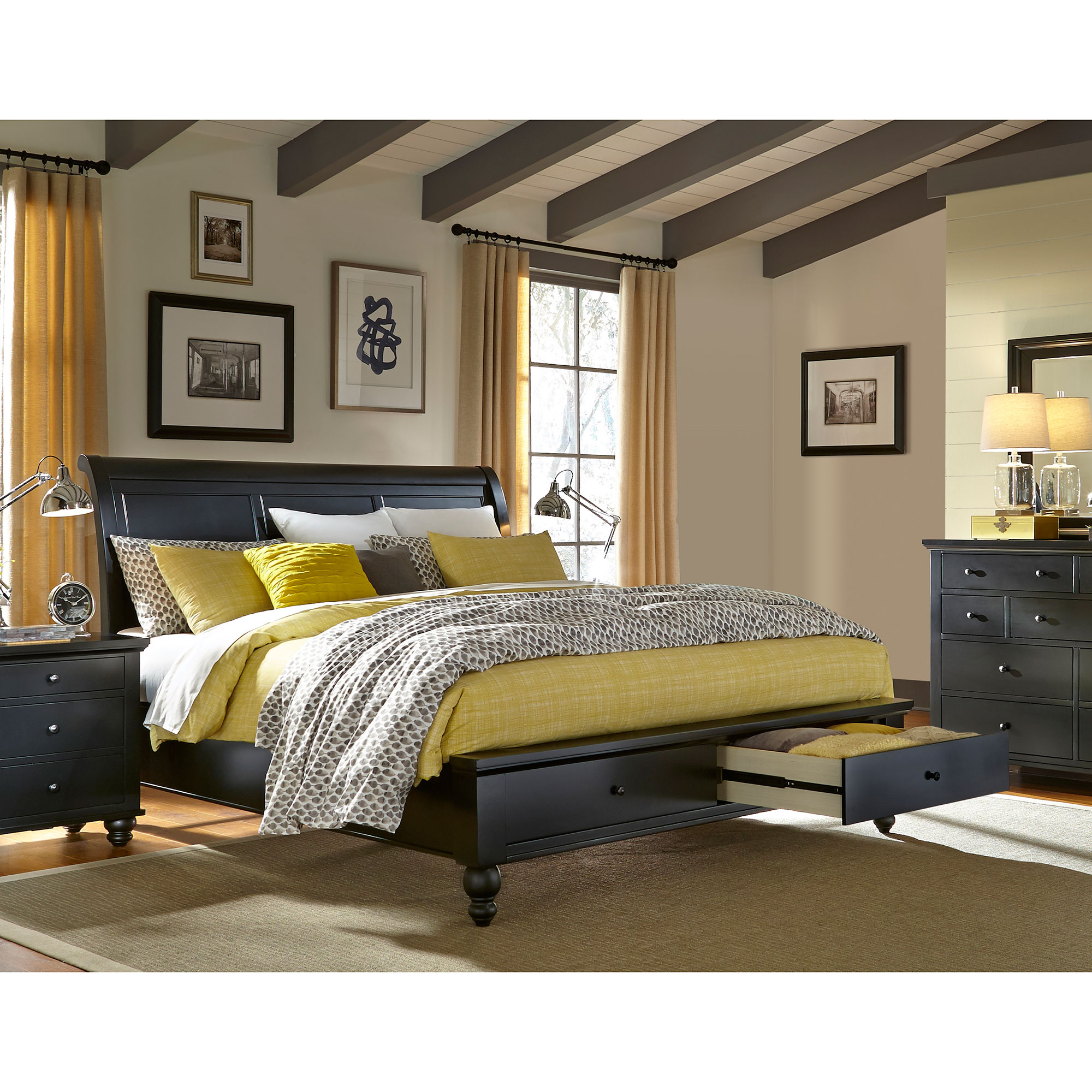 - Sleigh bed includes two large drawers, conveniently located at the footboard of the bed