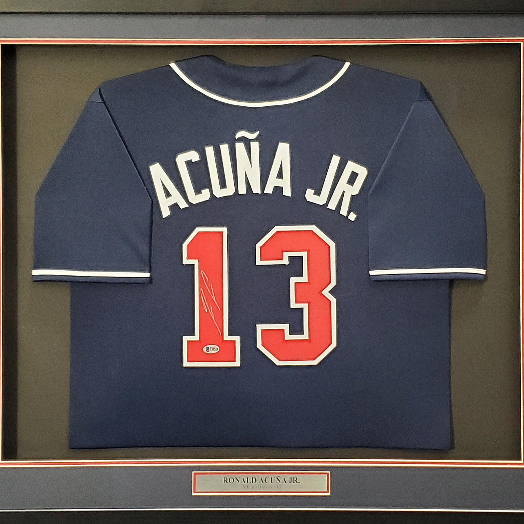 Elevate your baseball memorabilia collection with the Ronald Acuña Jr. autographed framed blue jersey from the Atlanta Braves. Authenticated by Beckett, this collector's item adds a touch of sophistication with its framed presentation. Ronald Acuña Jr.'s signature on the blue jersey further enhances its value for devoted Braves fans and collectors alike. This framed piece not only celebrates the talent of Acuña Jr. but also adds a stylish and iconic touch to your sports memorabilia display. Secure this Beckett-authenticated gem, embodying the spirit of the Atlanta Braves and the excellence of Ronald Acuña Jr. in the world of baseball.