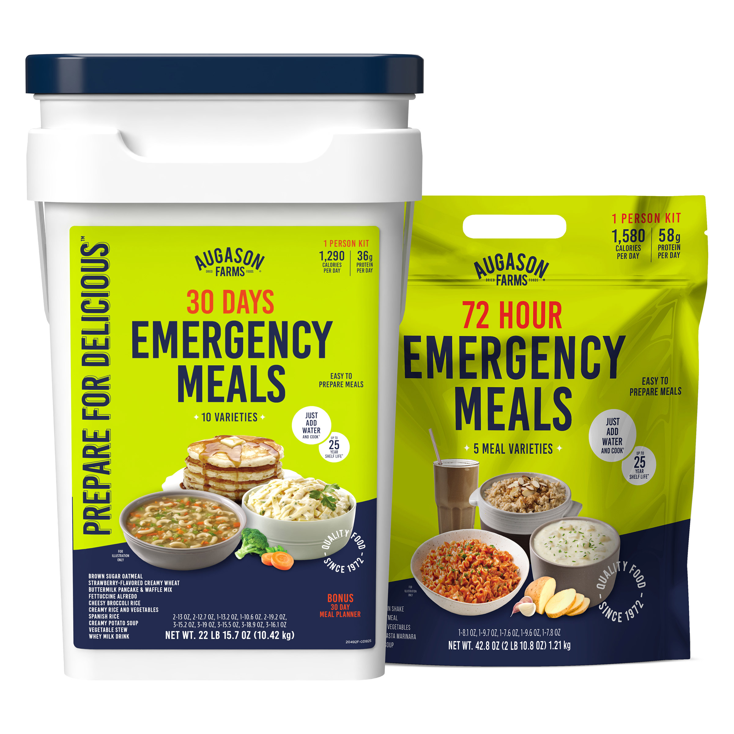 *Shelf life ranges from 20–30 years depending on food type. Unopened products retain their shelf life after the kit container is opened. Best stored in a cool, dry place at 55°F–70°F. Actual shelf life may vary based on storage conditions. 72-Hour 1-Person Emergency Meals Kit When disasters strike—whether downed power lines, road damage, flooding, or snowstorms—emergency crews may not reach you for several days. The Augason Farms 72-Hour Emergency Meals Kit ensures you’ll have what you need when it matters most. Designed for affordability, convenience, and portability, this kit is small enough to stash anywhere you spend time—home, workplace, vehicle, RV, cabin, boat, or dorm room. Weighing just 2.5 pounds, it fits easily into backpacks, drawers, or saddlebags. Simply add water, simmer, and enjoy hot, satisfying meals. Features: