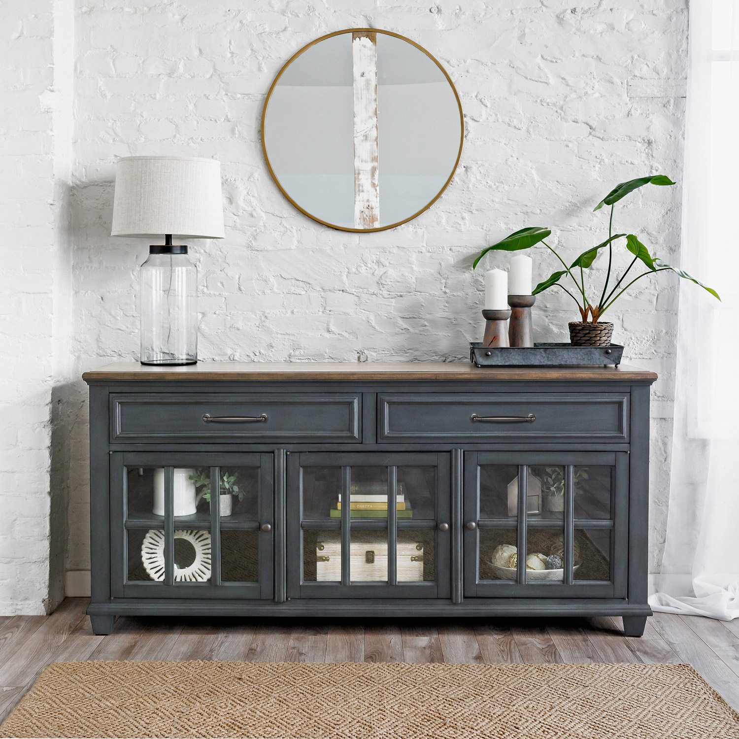The Pike & Main Bartlett Accent Console is constructed with solid mahogany and hickory veneers. With an arrangement of 2 drawers and 3 cabinet doors with adjustable shelves, the console provides a variety of storage options. Elegantly finished with a distressed slate case and chestnut top, it offers a fresh take on traditional construction and details. Comfortable in any room whether providing storage or establishing a focal point.