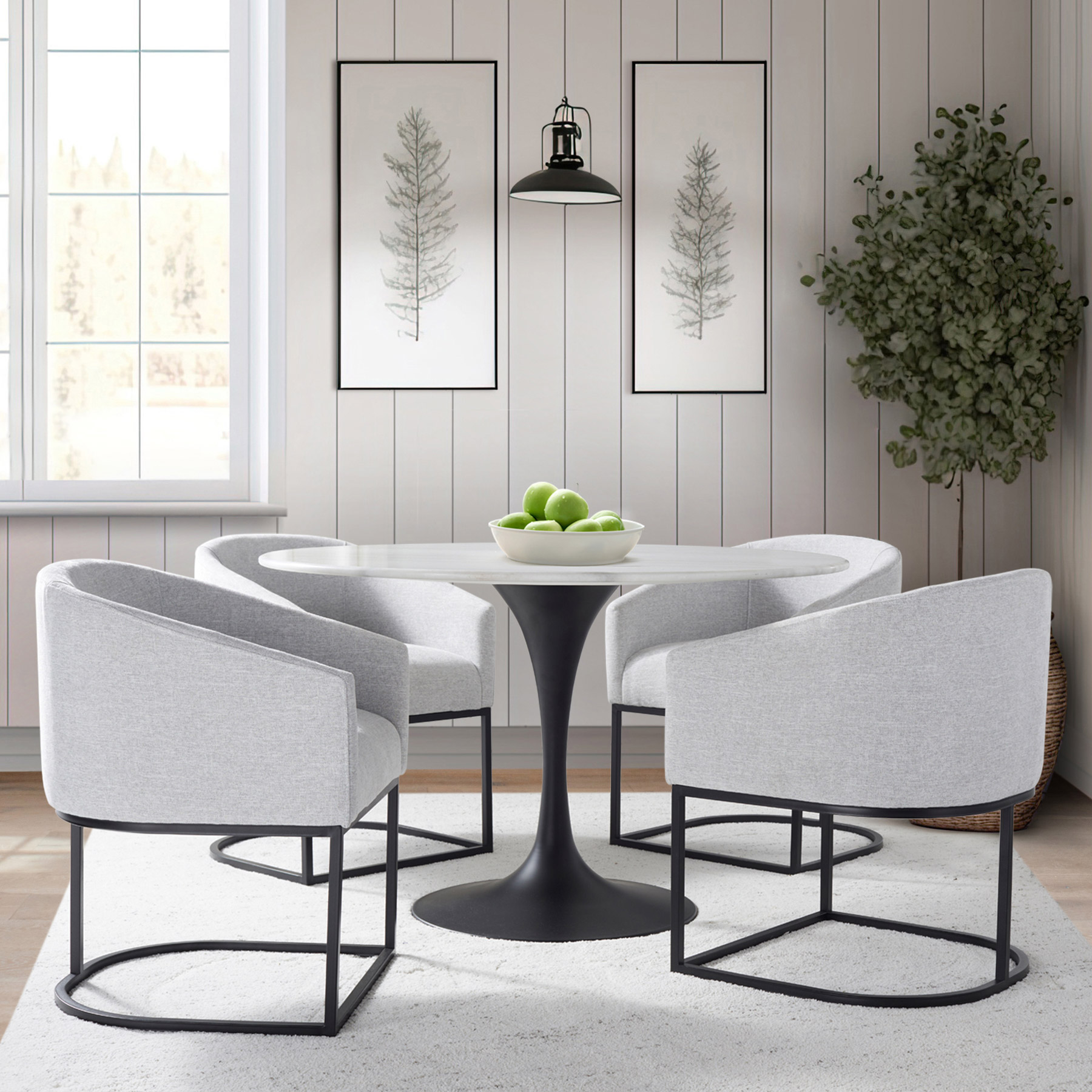 Product Label Product Label The Bastion Dining Set by Abbyson is an effortlessly modern design with a sculptural silhouette and a pleasing mix of materials. The elevated style of this dining set includes a cool white marble tabletop with unique dark veining to complement the classic black metal tulip base for a sophisticated look that will enhance any décor. The chairs are upholstered in 100% polyester fabric and feature clean lines and smooth rounded edges that bring the furniture to life. The Bastion collection includes a round dining table with seating for up to four; a perfect centerpiece to create an elegant dining space, or an inviting cozy breakfast nook.