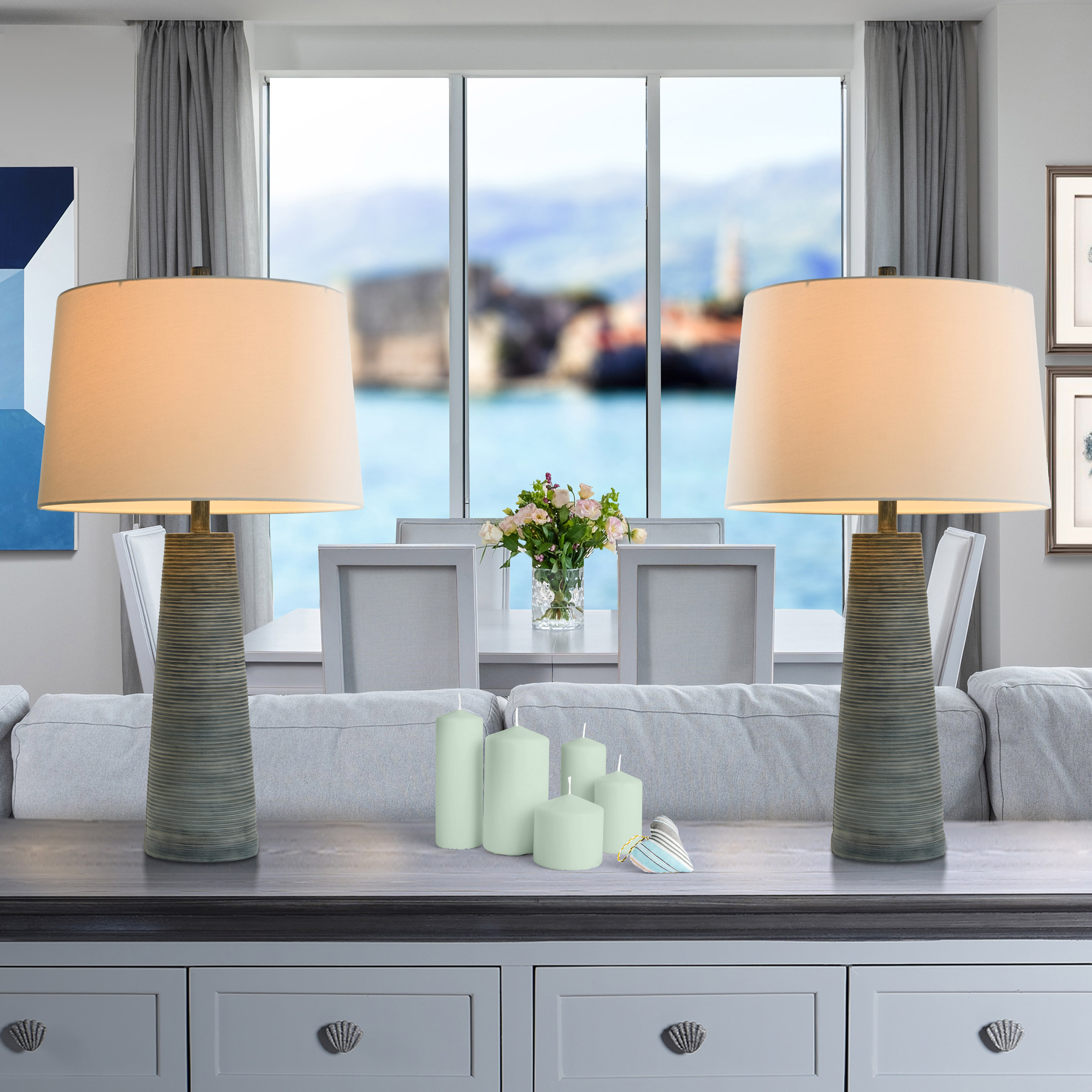Bring style and lighting to any space with this set of Bentley Table Lamps. This gorgeous lamp set makes a great addition to your indoor lighting. It features tapered ribbed design on the colored resin base for textured flair. The white tapered drum shade offers a crisp modern look, while the one-way light setting with a simple rotary switch allows for easy operation. Place them on the side table next to your sofa or console in your living room or entryway for an inviting glow.  Features: