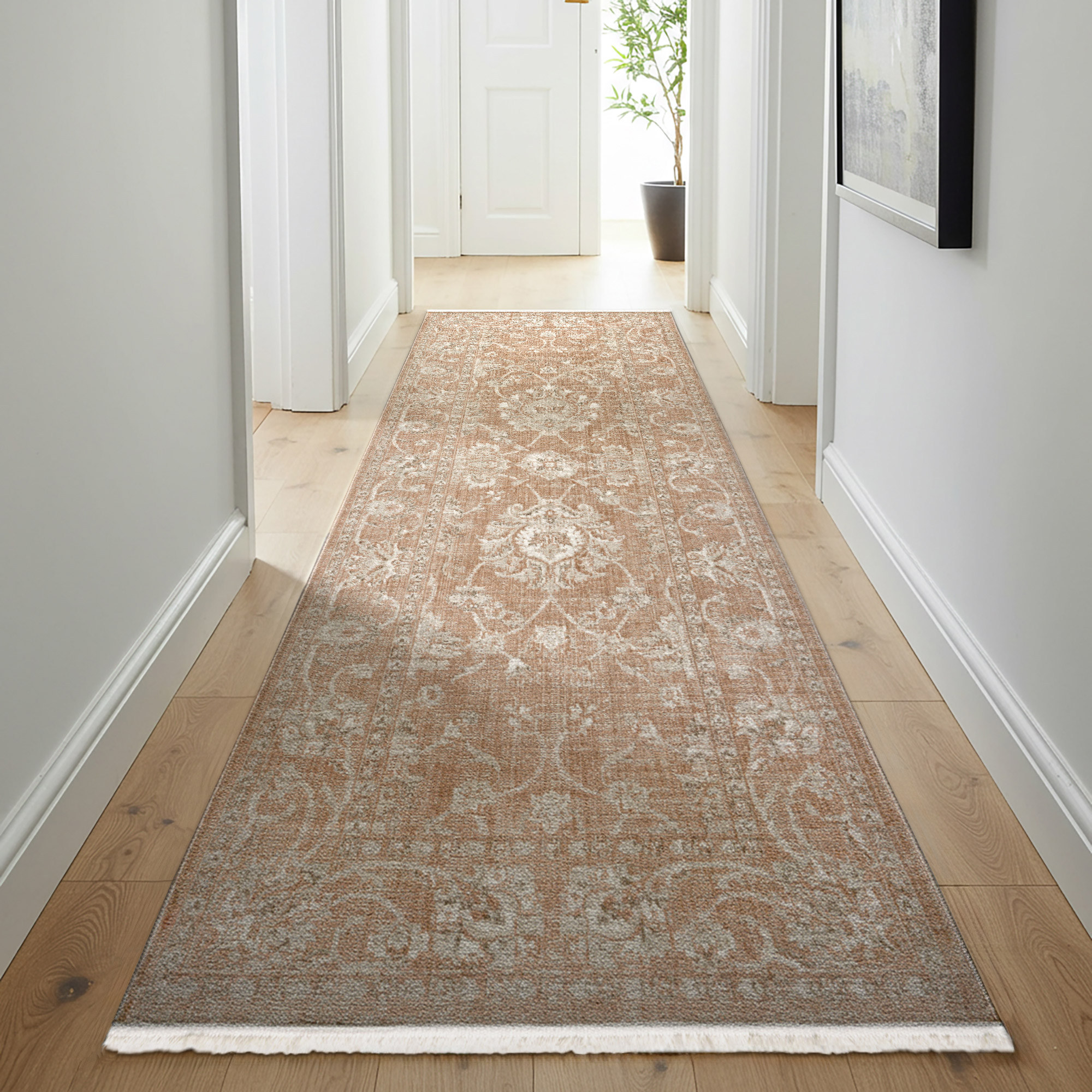 The Berkshire rug collection combines timeless elegance with practical design, making it a perfect addition to any home. Expertly woven in Turkey on precision Wilton power looms, these rugs showcase a warm dusty blush terracotta base background with intricate ivory and soft white floral motifs, accented with touches of pale grey. Crafted from high-quality polyester pile yarn, Berkshire rugs offer a plush feel underfoot while maintaining exceptional durability. With a low-profile pile height of .20 in to .24 in, they are ideal for high-traffic areas and won’t interfere with most door swings. Built to withstand everyday wear, Berkshire rugs effortlessly blend style and function, enhancing any décor with lasting beauty.
