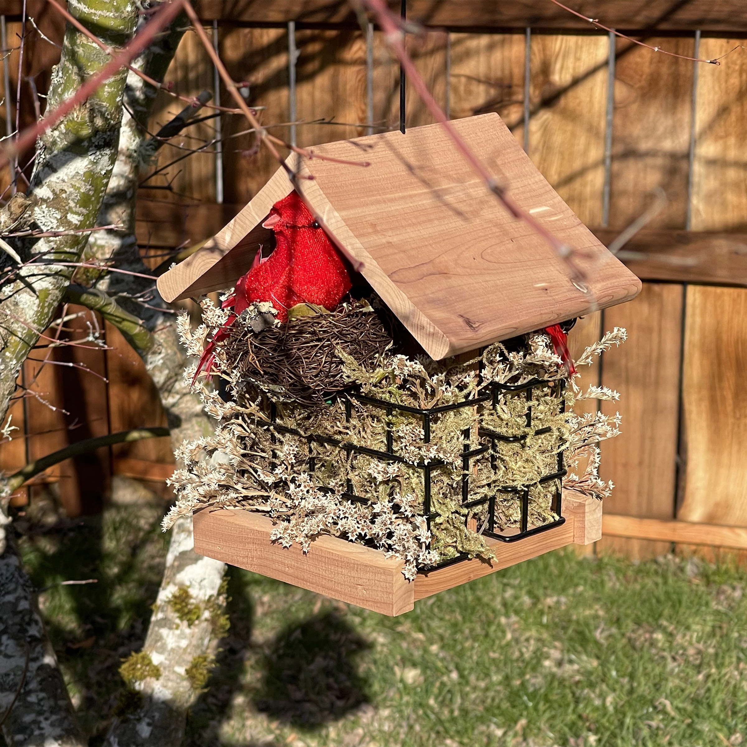 This centerpiece is a birdhouse that comes decorated with an all-natural feel. No floral foam in this piece; only moss and white statice are used. There are two red cardinal birds and two bird's nests added to each piece for decoration. The top comes off so that the greens can be removed and suet can be placed into the cages to transition it into a bird feeder when the natural material has lost its luster. Decorated it is approximately 7 x 7 x 6.5 when decorated and is 6.75 x 6.75 x 6.5 without greens. The box size is 11 x 10.5 x 12 and is 5 pounds when packed.Product Details