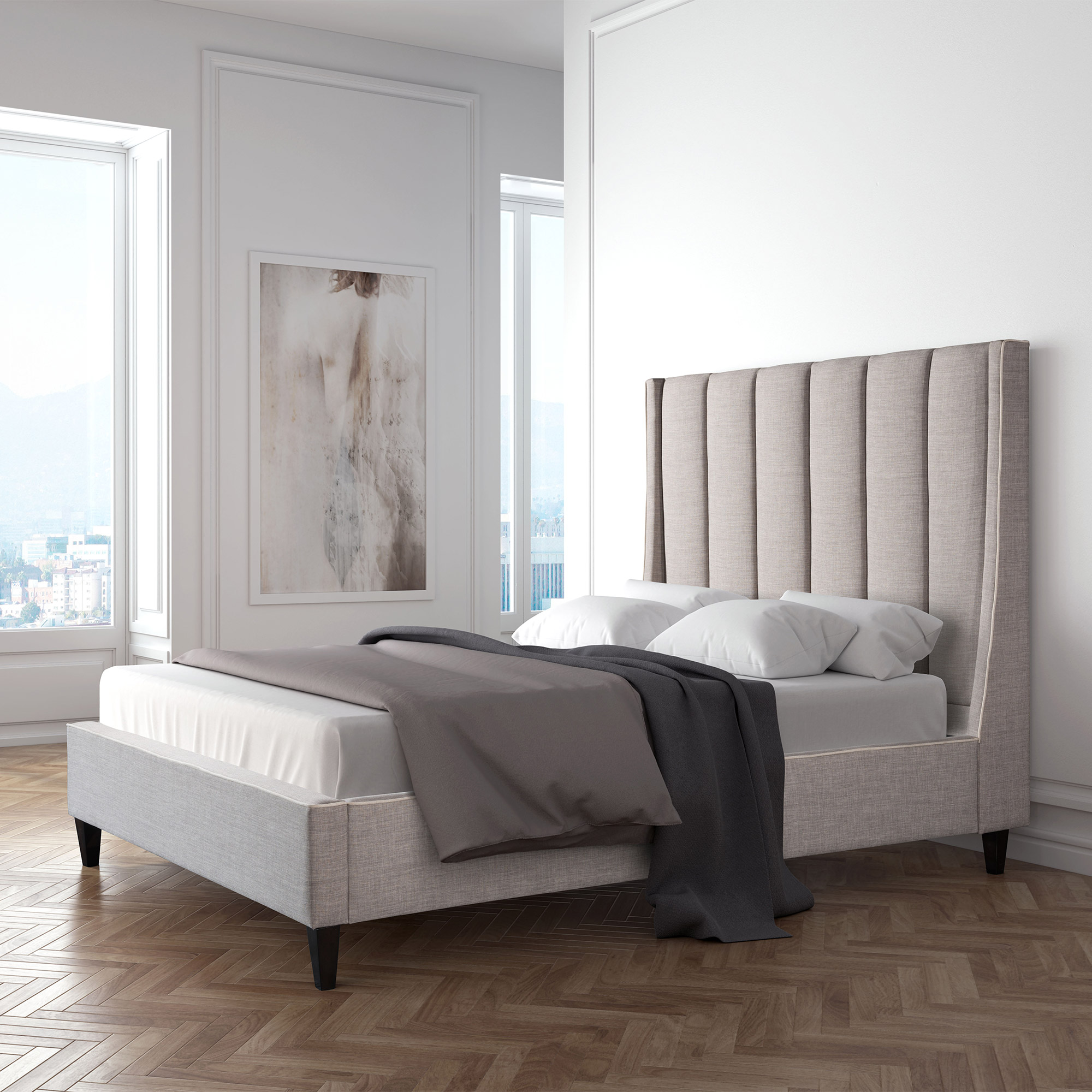 The Blakely Queen Bed is elegantly upholstered in Dove Grey Poly-linen fabric with slim tufted panels on the headboard and features contrasting white trim on the side wings and edges of the bed. European slat system needs mattress only for ultimate comfort.
