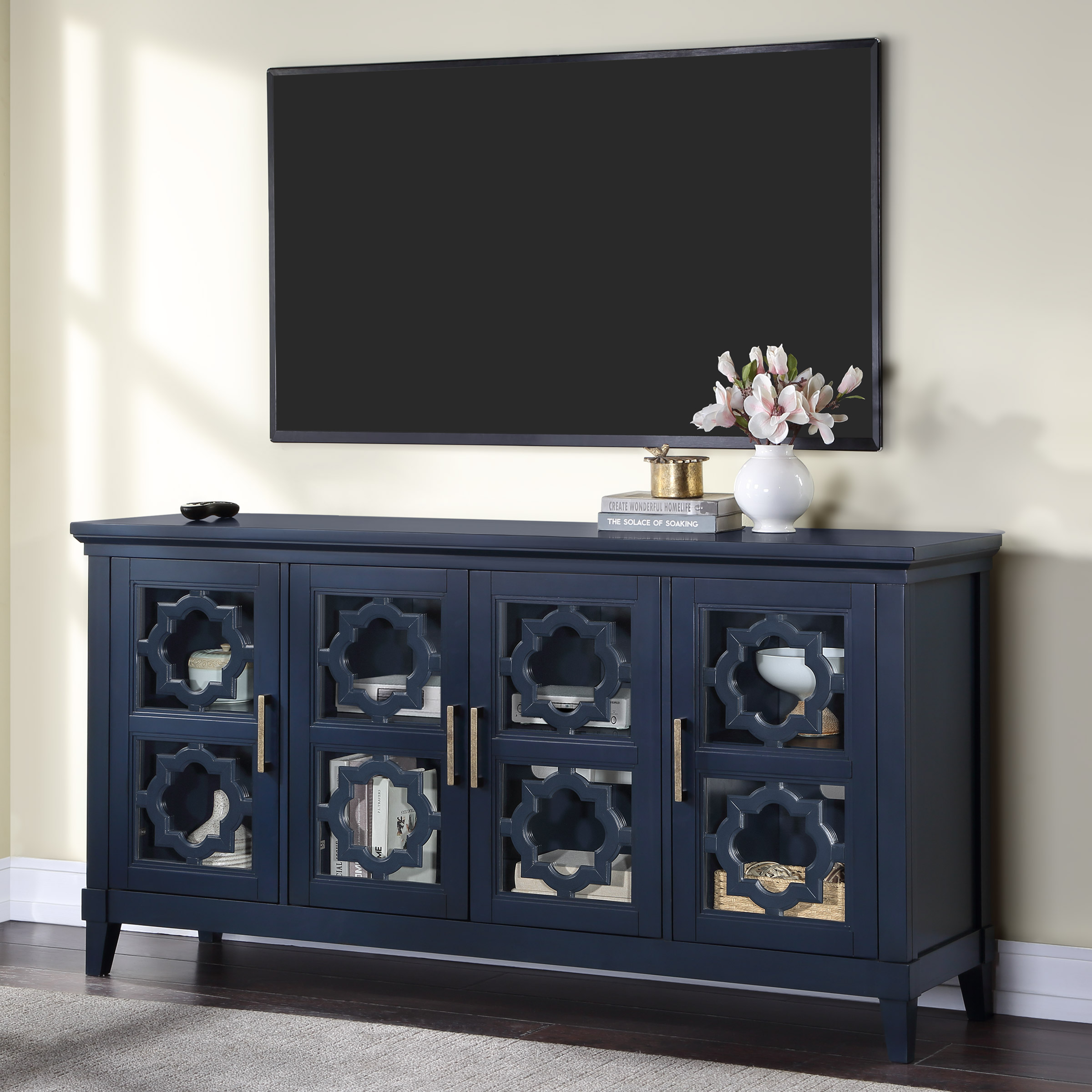 Enhance your décor with the 70” Blue Medallion Console. This console is not only beautiful, but highly functional. Use it as your media cabinet or as a decorative accent piece. The Blue Medallion Console is completed in a hand applied multi step finish that truly makes a statement. At 70” wide, you’ll have plenty of storage space for all of your needs. It features adjustable shelves, and wire management to accommodate your media components. You can change the look of your console depending on the front panels you choose. It comes with wood and glass panels to give you an all glass look, or an all wood look that is enhanced further by the decorative medallion accents. The antique hardware is the perfect finishing touch to this new addition to your home.