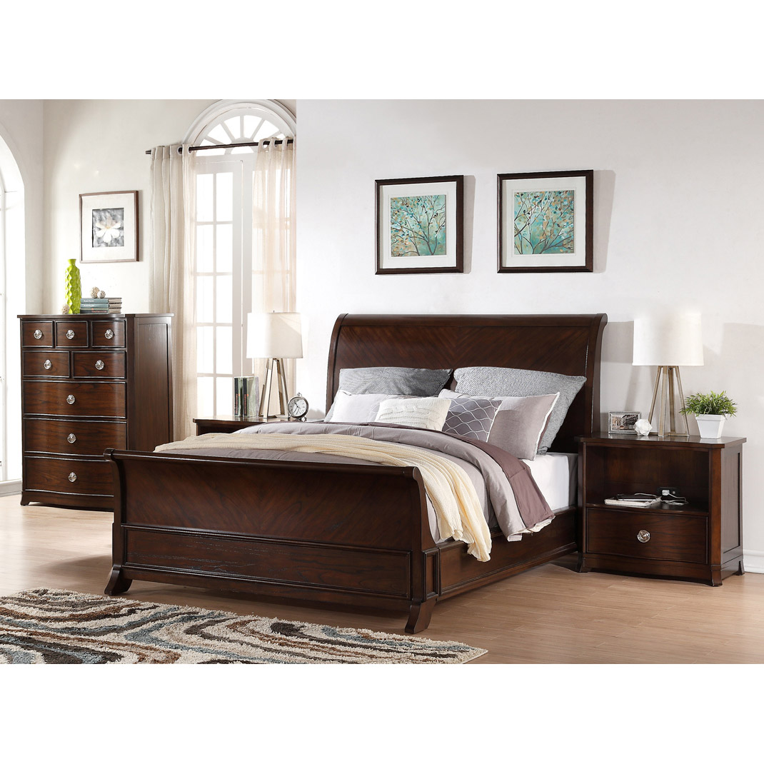 The Bordeaux is a truly special introduction to your home. Elegant, classic, and modern, this beautiful bedroom collection will make your room complete. Each piece is completed with a multi-step rich espresso finish and accented with modern nickel hardware. The 4 piece king group features a bed, a handsome chest of drawers, and 2 stylish night stands. The classic sleigh style bed features a book match veneer finish pattern for added beauty and is supported by a sturdy hardwood slat support system Complementing your bed are the matching bedroom case pieces. Notice the style of the curved serpentine shape of the front which sets Bordeaux apart. Each drawer is built of the highest quality featuring English dovetail joints as well as felt lining for the top drawers of the chest. All drawers feature ball bearing slides for quality and ease of movement. The chest of drawers is functional as well as stylish with 8 functional drawers. The 2 night stands are amply sized at 30”W and feature a storage drawer as well as a charging station for all of your charging needs. The Bordeaux will make a statement to your décor and make you feel at home.