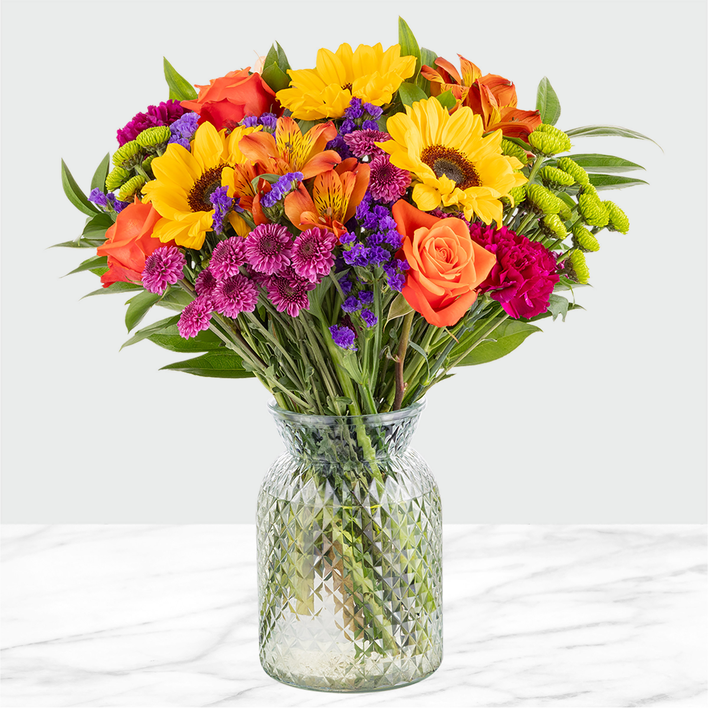 How to Order: We will attempt to deliver your floral order by the end of the day on your preferred arrival date, however, your order may arrive one day before or after your selected date. Pick your arrival date from the calendar during checkout. Arrival dates are based on the farm’s availability. Next day orders must be placed prior to 11:00am PST Monday through Thursday, in order for them to arrive next day.  Due to the perishable nature of this item, orders do NOT ship Friday through Monday. Orders only arrive Tuesday through Friday. You can choose your arrival date from the calendar during checkout. Delivery exclusions apply, see calendar at checkout. Floral Details: Bursting with rich purples, radiant orange roses, and golden sunflowers, Bountiful Garden is a joyful celebration of color and life. This lush, vibrant mix feels like a warm embrace from nature – full of heart, warmth, and effortless beauty. Stems Include: Roses, Sunflowers, Alstroemeria, Carnations, Pompons, Statice, Ruscus, Cocculus (25 Stems) NEED HELP? We are here to help! You can reach us directly at the contact information below. For cancellations or rescheduling, please contact us within 48 hours of placing order. For overnight deliveries, orders cannot be cancelled. For answers to frequently asked questions, please enter the following URL into your search bar: www.kendalflowers.com Email:  costco@kendalfloral.com Phone: 855-848-9817 (7:00AM - 3:00PM PST, M-F) SUGGESTIONS Tell them how you feel! Gift messaging available during the checkout process. If you want gift messages on multiple orders, individual orders need to be placed. Are your flowers for an event? Many of our flowers ship in bud form. We suggest ordering your flowers to arrive 2-3 days before your event to allow them to bloom. Did your flowers arrive looking thirsty? No worries! Just follow the included care and handling instructions to properly hydrate your flowers. After a fresh drink of water, your flowers will blossom and look more full. Flowers pictured on the site are taken after three days in water.