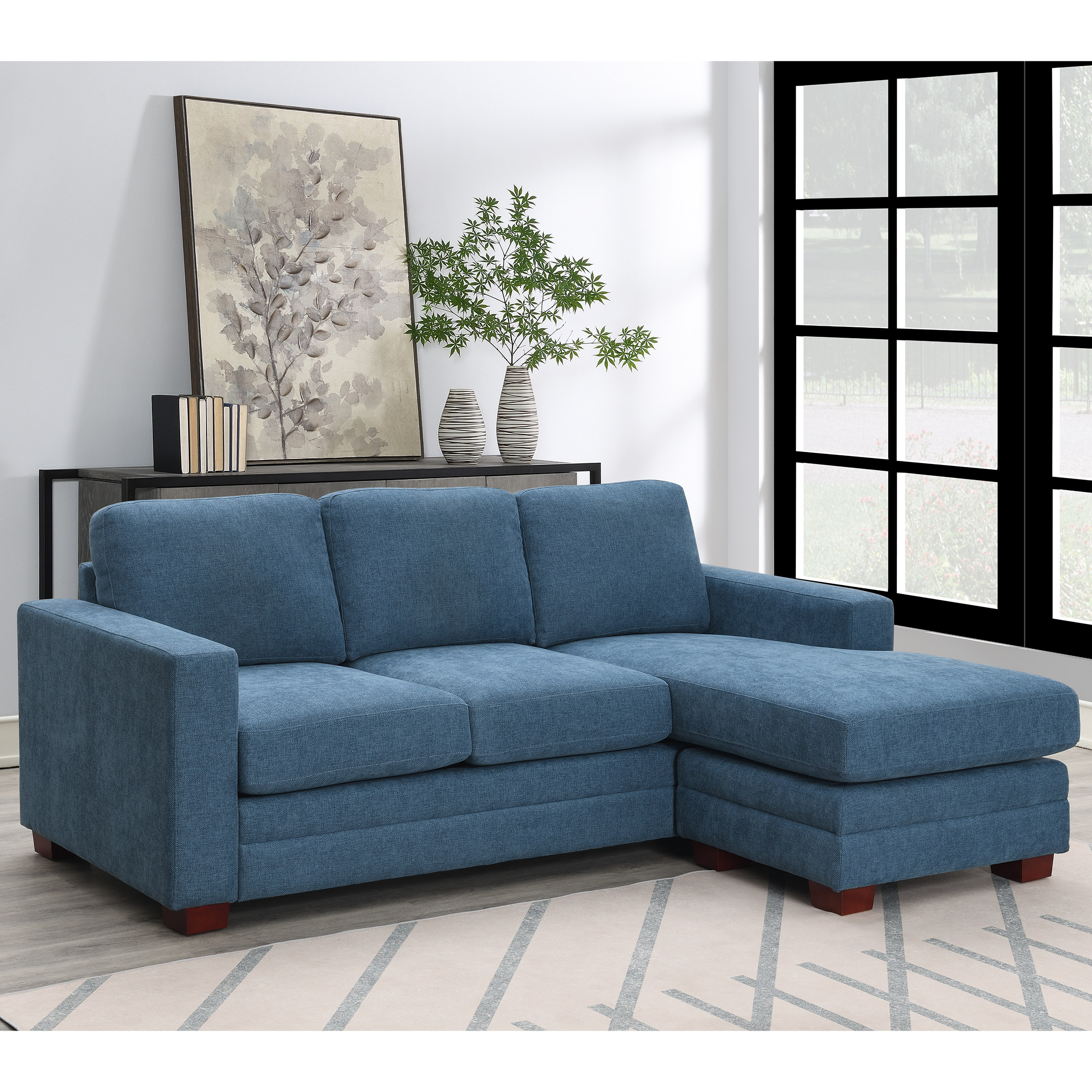 A great place to put your feet up, read a book or surf the web. This beautiful blue shade is exactly what will give a room a refreshing kick of color and comfort. The reversible chaise allows the sofa to fit the aesthetics in any space of choice.