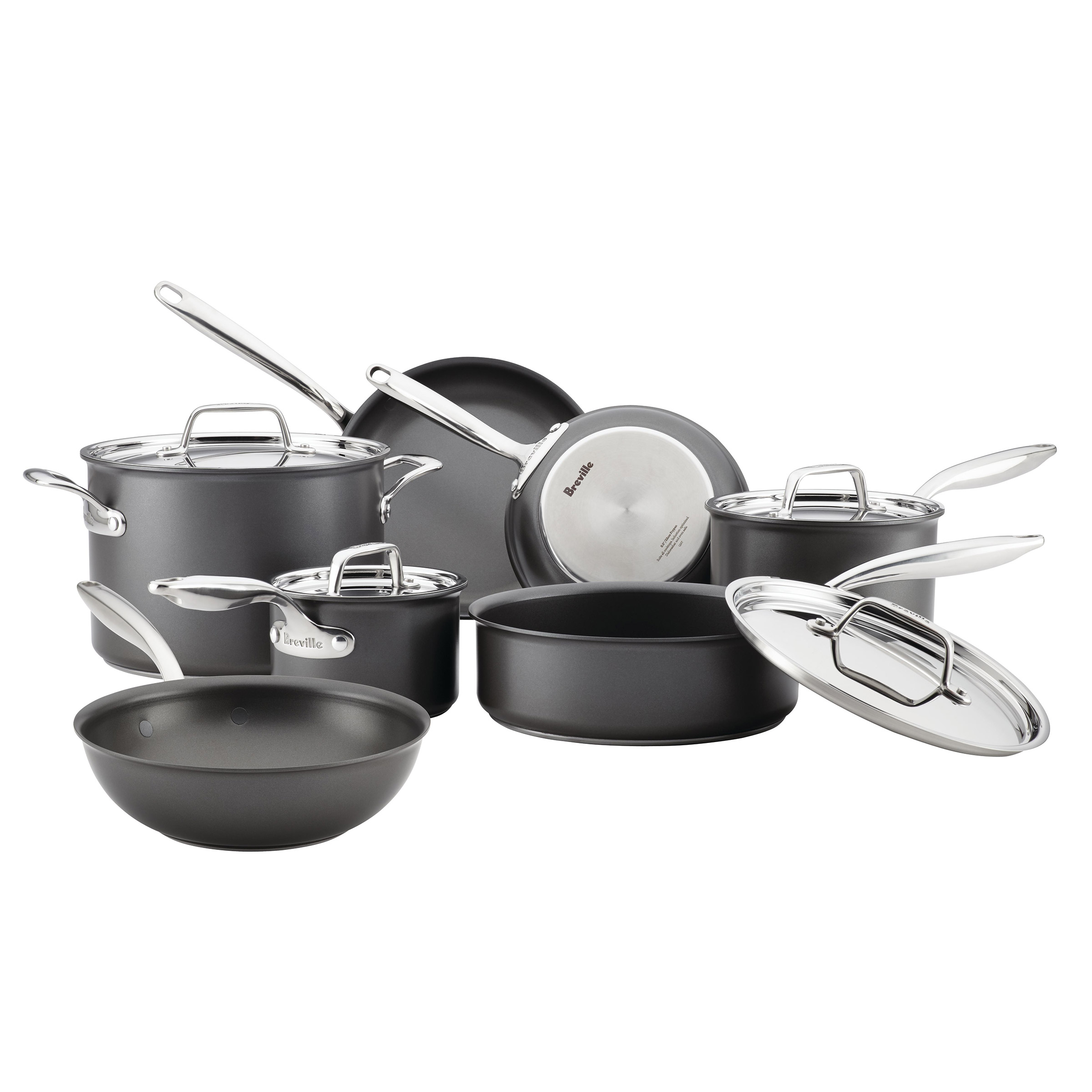Superior heating and cooking performance built to last: that's Breville® Thermal Pro® Hard-Anodized Cookware. This exceptional cookware features durable hard-anodized aluminum construction that efficiently distributes heat, and the impact-bonded, warp-resistant pan base controls temperature fluctuation even as ingredients are added and removed. Cookware form follows function with curved interior profiles to enable full utensil access around the stockpot, saucepan and sauté bases and make cleaning easier. Triple-layer nonstick inside and out delivers exceptional food release, and is metal utensil and dishwasher safe. Distinctively flared rims on all the pots and pans enable drip-free pouring.