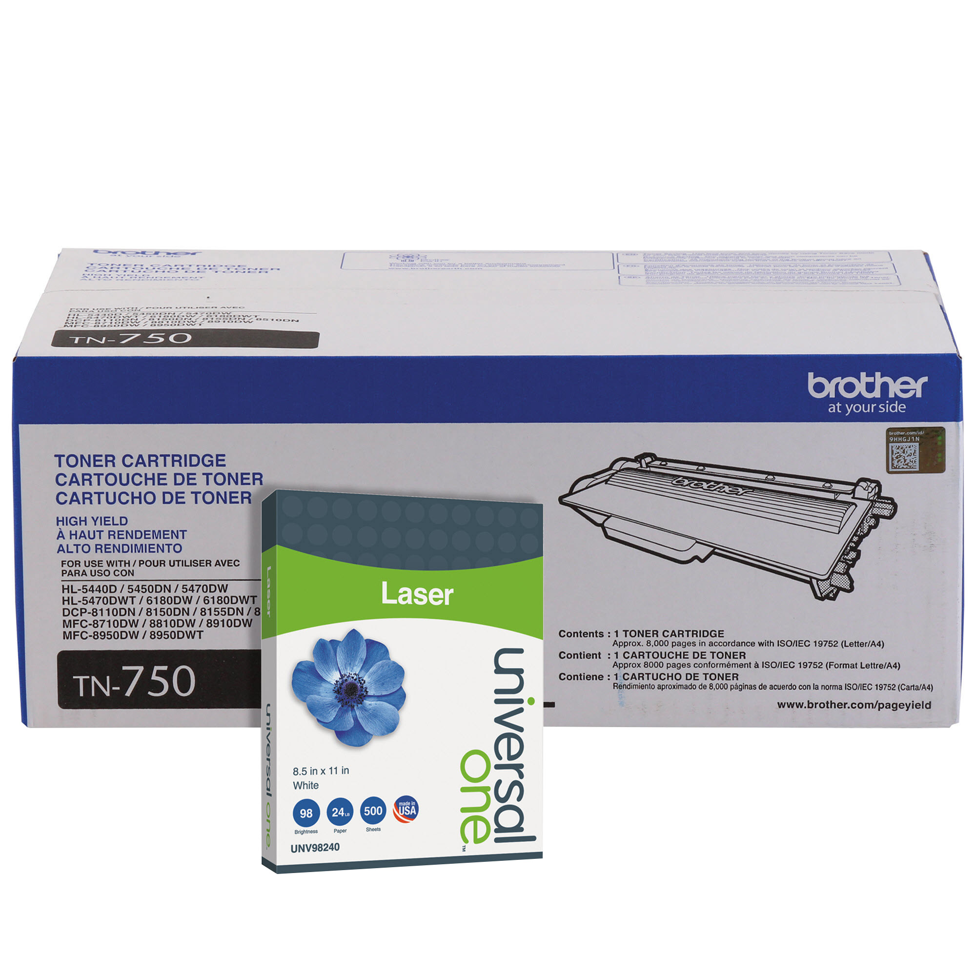 Brother TN750 High-Yield Toner Cartridge, Black, 2-pack with Bonus Ream of Paper