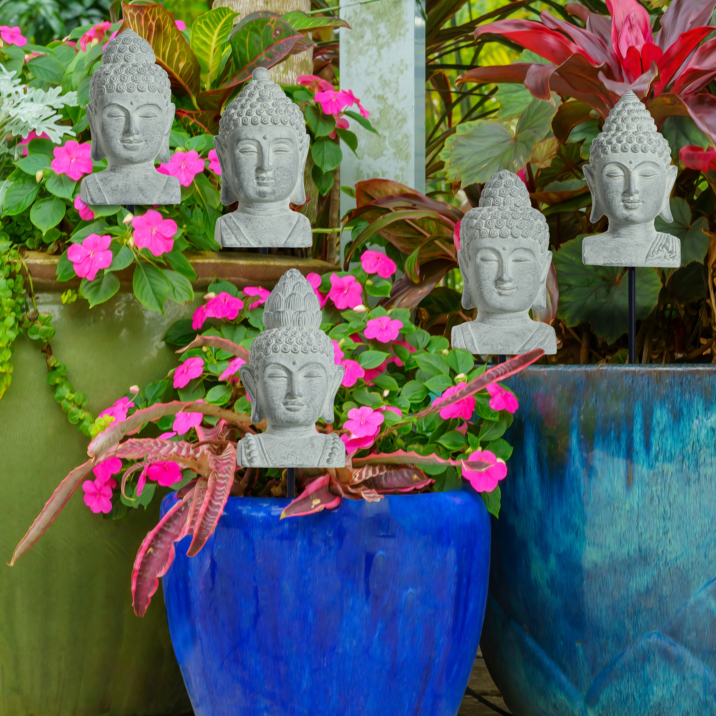 Dress up your planters and garden areas with these Buddha planter stakes. The two-part stakes allow you to place these in a variety of planter sizes and depths. Or put them around flower beds for decorative interest.  Perfect as gifts! Features:
