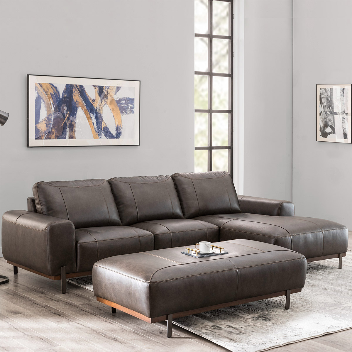 The Camilla 3-piece Sectional provides family-friendly seating for 4 people. Camilla is covered in a soft 100% Top Grain leather with split leather on the sides and backs for easy care and cleaning. Camilla features padded sides and backs for added durability. The foam seat cushions are soft and provide ample comfort and support. Camilla features a solid wood base in a honey brown finish with solid metal legs. The solid wood frame is corner blocked with reinforced joinery for lasting durability, while sinuous spring suspension supports the cushions. The cushions are removable for easy cleaning. Camilla features a large cocktail ottoman offering additional seating and comfort.