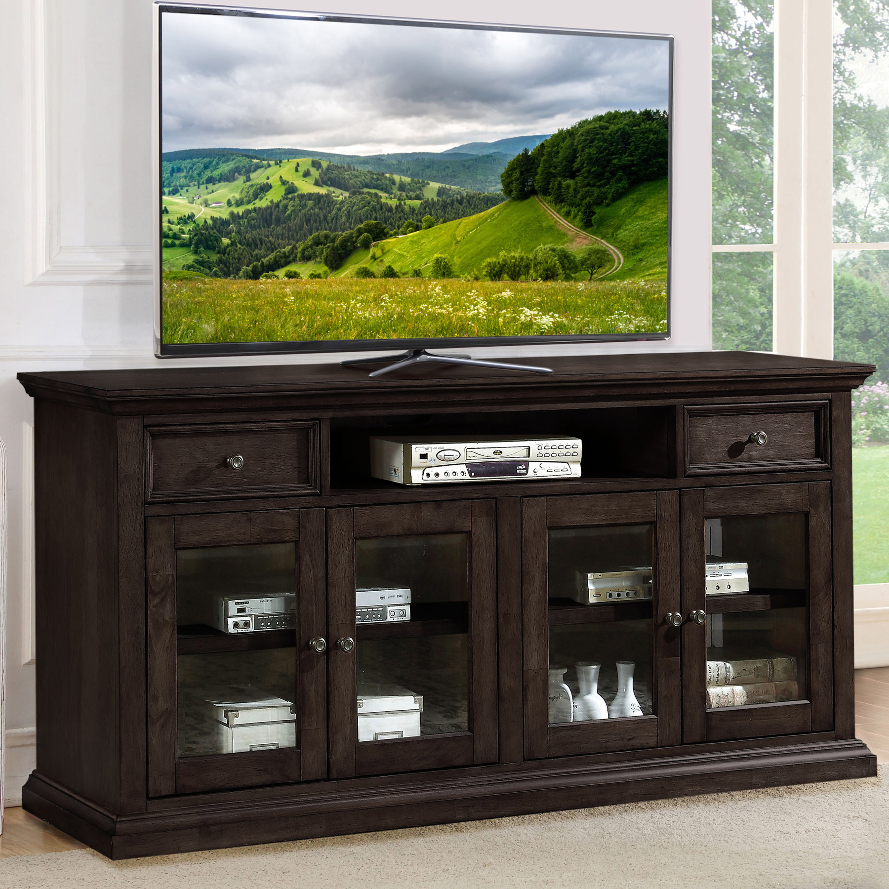 The Campbell 75” Media Console by Abbyson is designed to satisfy all of your home entertainment needs. Constructed with durable rubberwood and birch veneers, the rich brown or black finish is hand-applied and utilizes a multi-step finishing process for lasting durability. Each unit is individually made by expert craftsmen with solid framing and traditional woodworking techniques. Featuring 4 wood-framed glass doors and 2 drawers, Campbell offers generous storage space for accommodating all your multimedia equipment and accessories. Innovative and functional, the console includes center shelving with ventilation holes, as well as removable back panels for easy management of wires and cables. This improves the air circulation throughout the entire console and helps keep your wires organized and out of sight. This unique piece is 75” wide from left to right, and able to accommodate various television sizes. Create a true home theater experience with the Campbell Media Console by Abbyson.