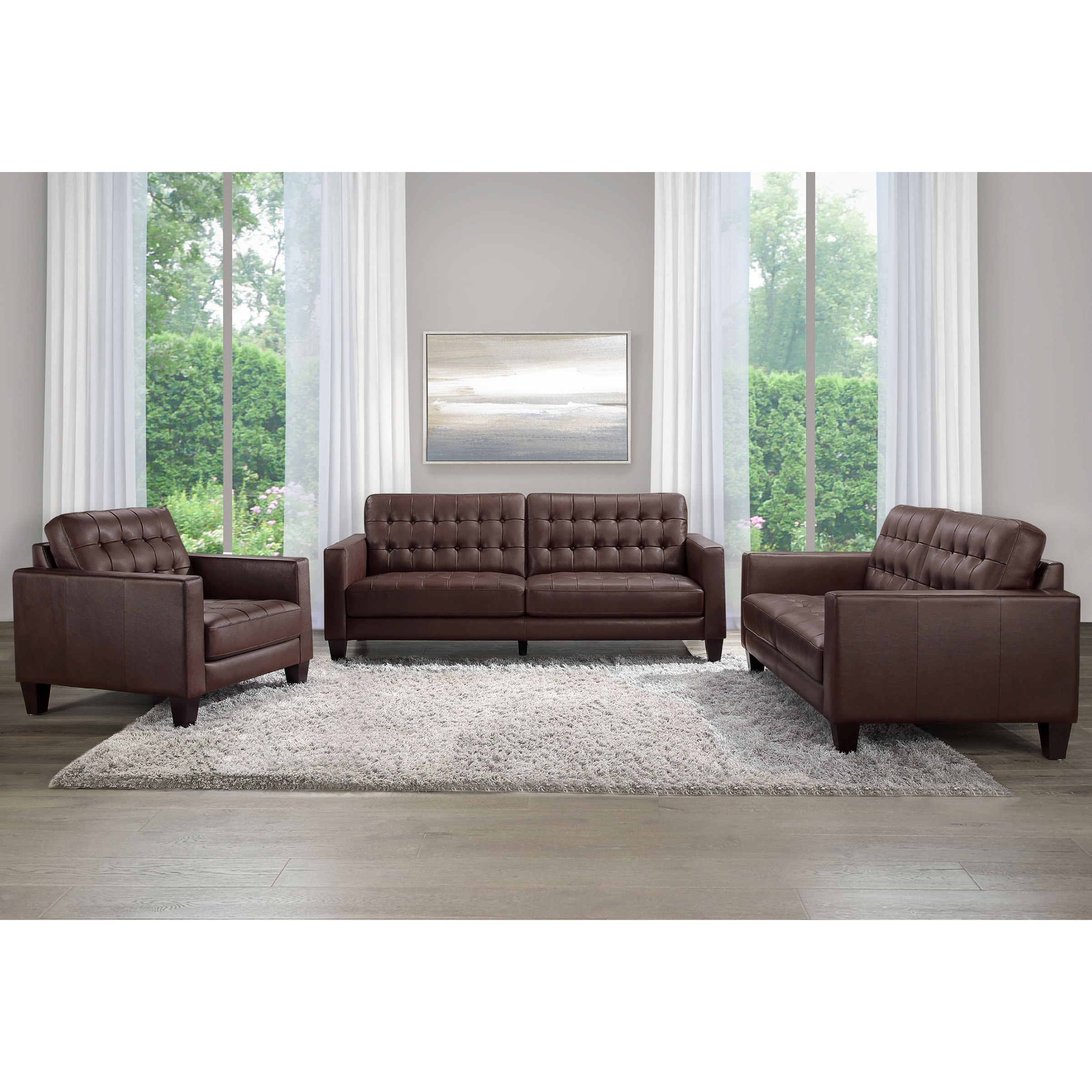 Where classic tradition meets designer style – the Carabella 3-piece Leather Collection by Abbyson features beautiful details that set the stage for this timeless design. Each Carabella piece is upholstered in soft yet durable top grain leather on all seating areas and is made using a kiln-dried wood frame. The classic tufted pattern is hand-crafted and outlines the seating and back cushions to add the perfect final touch. A seamless combination of 2.2 high density foam seat cushions and no-sag seat springs provides the right combination for maximum durability and lasting comfort, constructed to stand the test of time.