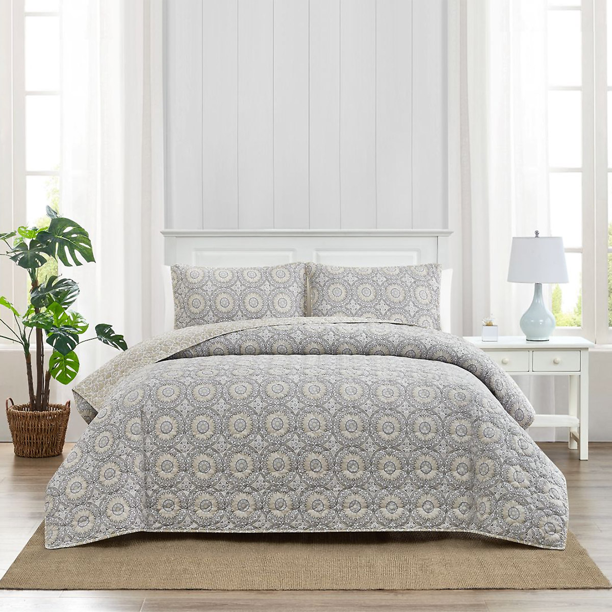 This versatile Cotton voile 3 piece quilt set turns any bedroom into a cozy oasis. Available in 5 reversible designs to compliment any décor and garment washed for a soft hand feel. The 3 piece set includes a quilt with 2 shams and is machine washable.