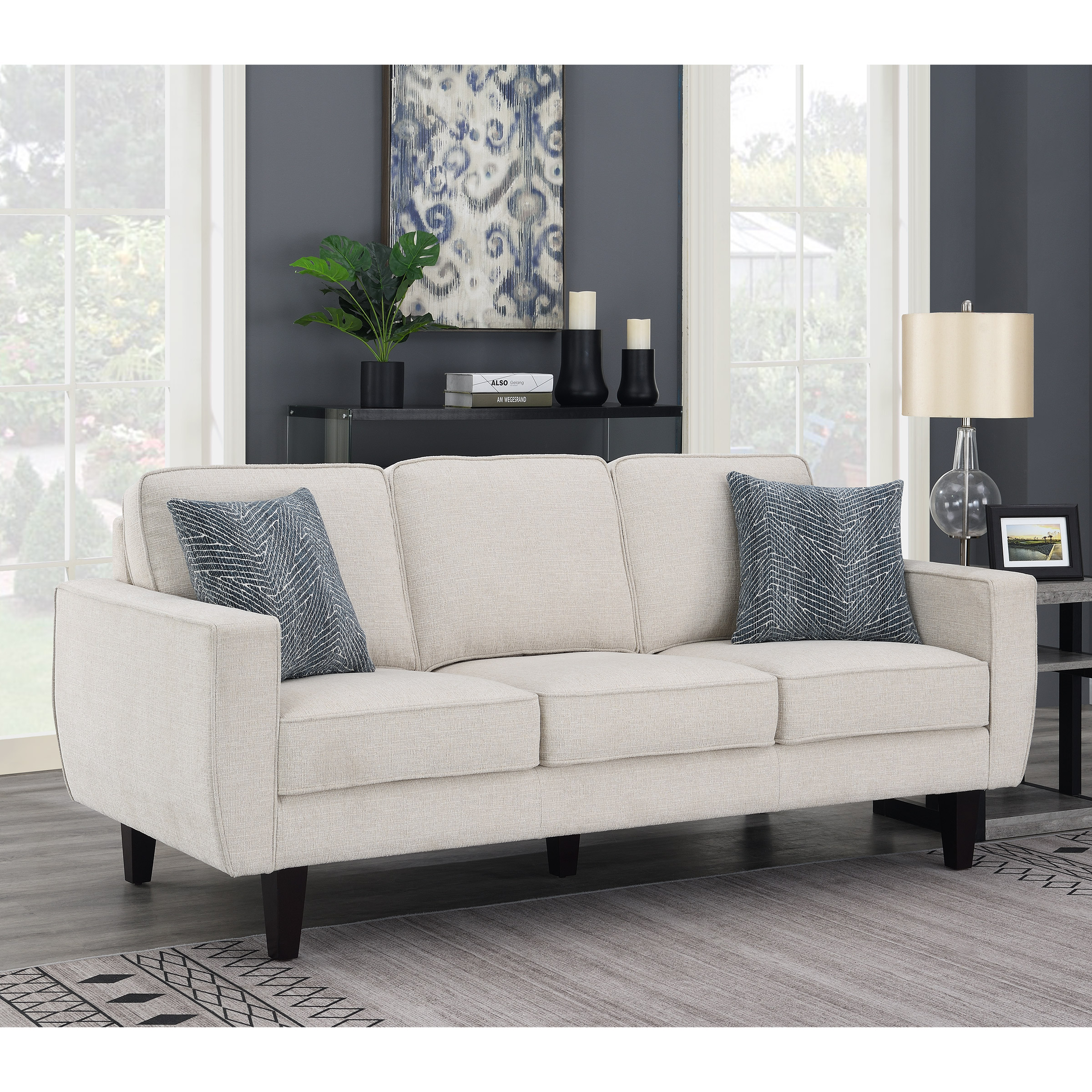 The Charley Mid-Century Modern Fabric Sofa is a welcoming spot to rest and relax after a long day. You will find true comfort in the seating construction featuring pocket coil springs encased with 2.0 lb. density foam, solid wood frame and sinuous springs. Wrapped with tight woven fabric and two accent pillows for a touch of style. This familiar casual, sleek design is sure to fit in any space large or small. A matching Charley Mid-Century Modern Fabric Chair is also available.
