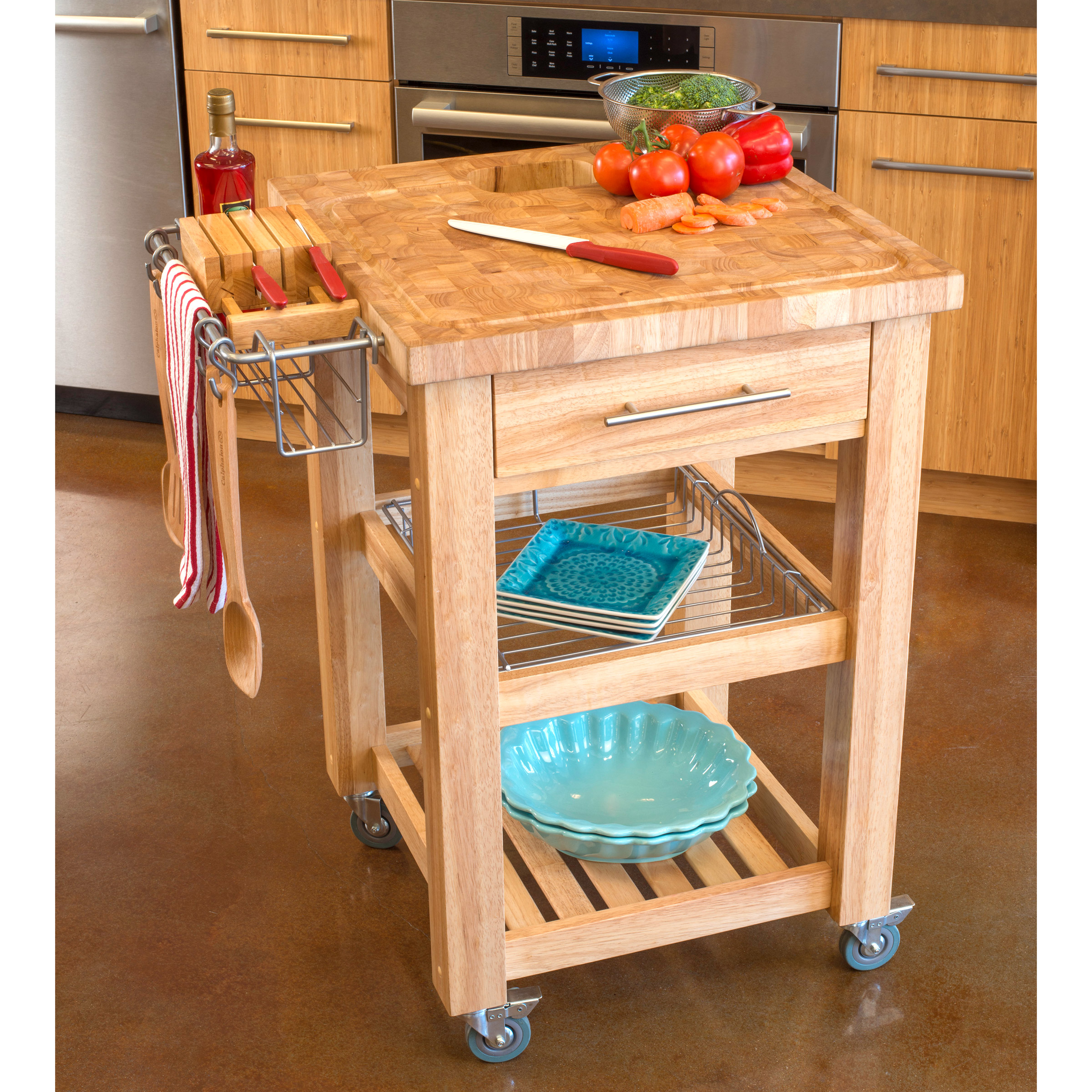 Professional chefs Chris & Chris created a compact work station with a frame and shelves made of solid hardwood and a rubber wood work surface that features their unique "Chop and Drop" system designed for sanitary food handling and quick, easy clean-up. Simply position the stainless steel Chef pan below the cut-out in the butcher block top to collect meat carvings and juice for use in your favorite recipes. For easy, sanitary disposal of scraps, simply insert the trash bag ring that's included and hang a trash bag from it. Regardless, use the juice groove carved in the cart’s top to guide food ingredients and byproducts to the worktop opening and into the catch pan or trash bag hanging below.