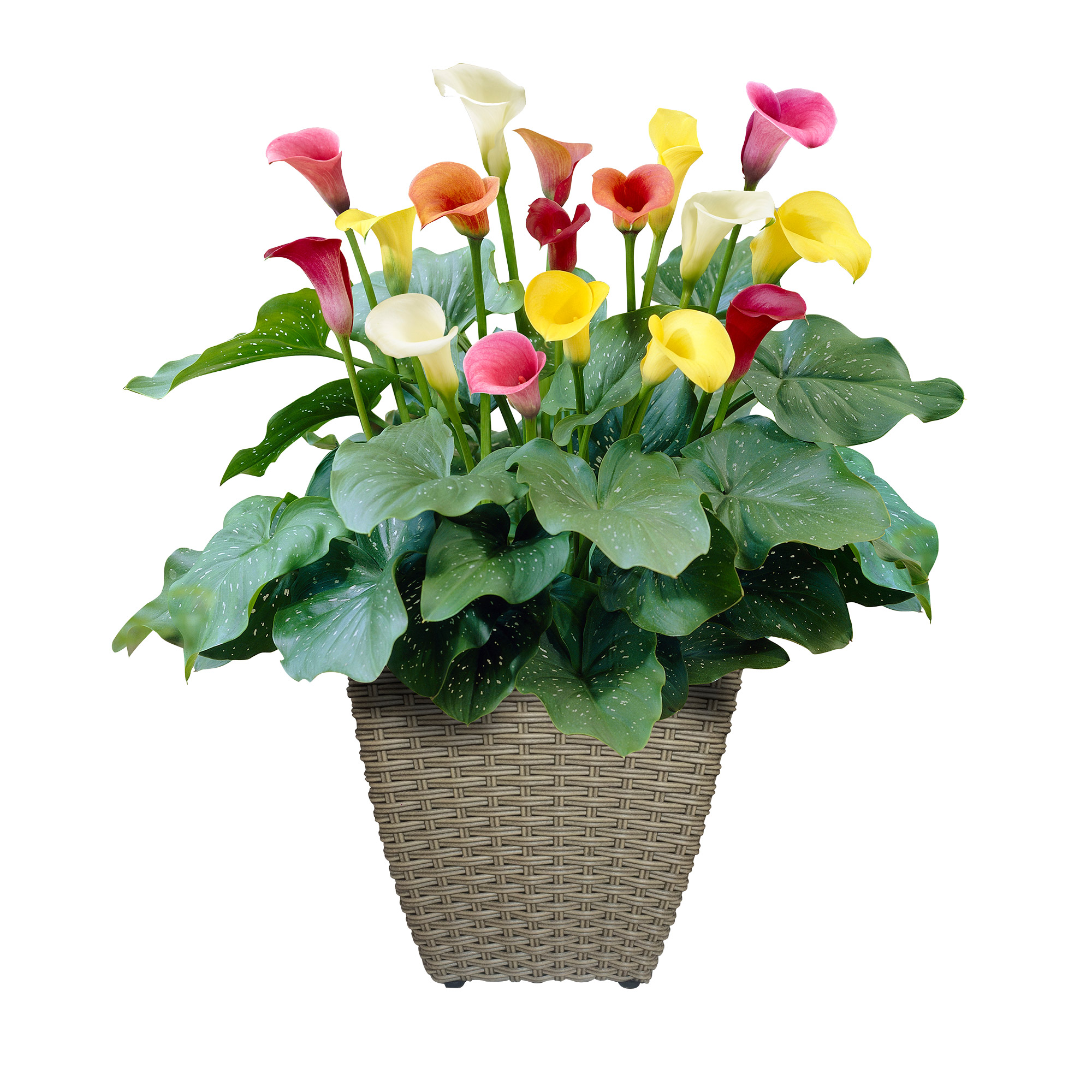 The Zantedeschia (or calla lily) is a favorite subject of many artists and an important art deco motif. It’s a dramatic and popular flower with thick leaves, shaped like arrowheads. An ideal plant for your patio where you can enjoy the beautiful plants with long lasting flowers. This bulb kit makes planting simple and comes complete with soil, bulbs and a large resin, woven planter. Just remove the packaging, plant the bulbs in the soil, add water and let Mother Nature take care of the rest. No green thumb is needed for success.