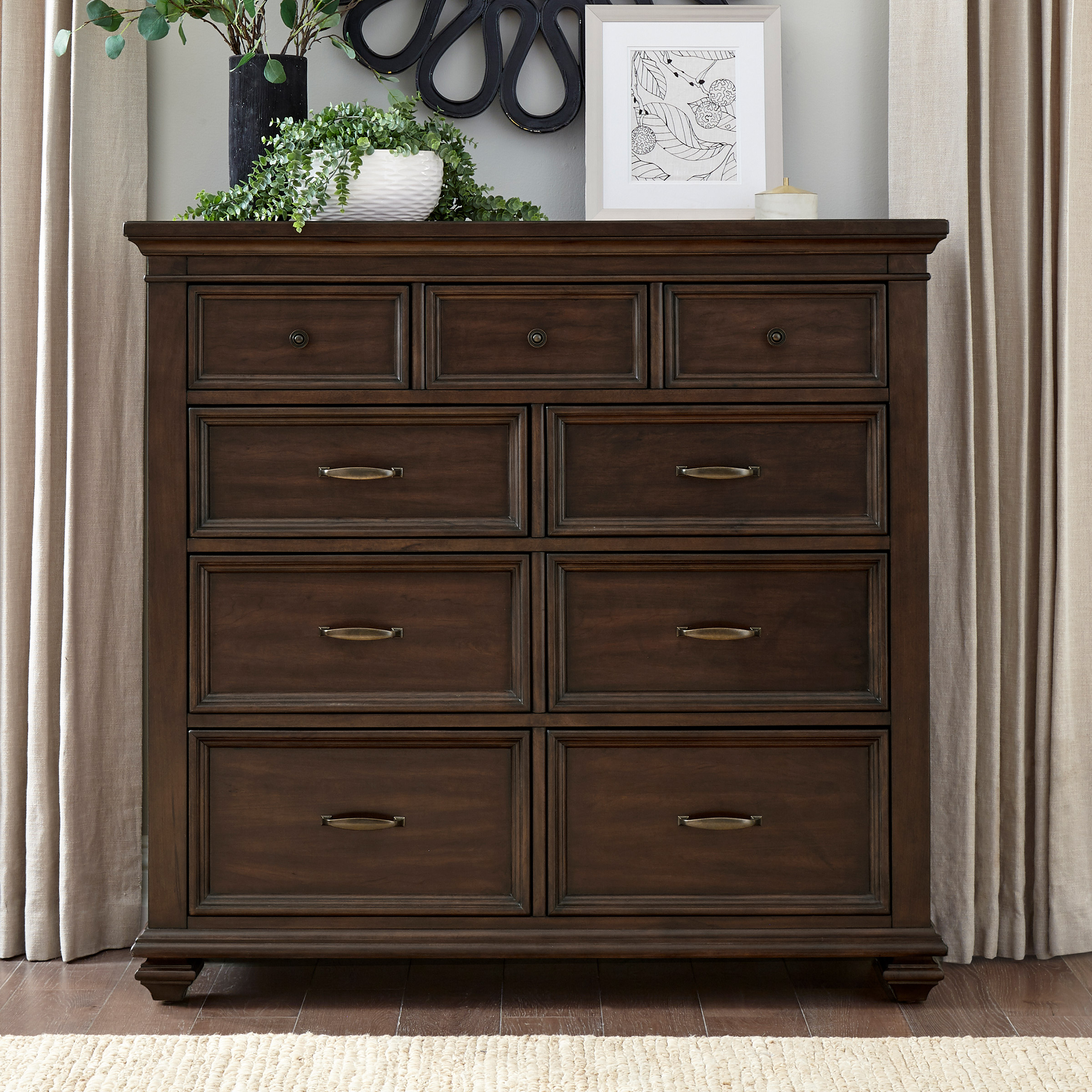 Time honored design and clean lines complimented by a rich walnut finish, makes the Conner Collection a great choice for any bedroom. The Gentleman’s Chest features detailed drawer font framing and crown molding. This piece features 9 drawers, offering abundant storage. Each drawer features Blum® premium, soft close drawer glides, English dovetail joints, and cedar-lined bottoms (bottom drawers only). Aged brass hardware completes this chest’s traditional and classic design. Add traditional style and multi-feature pieces to your bedroom with the Conner Collection (additional pieces sold separately). Features: