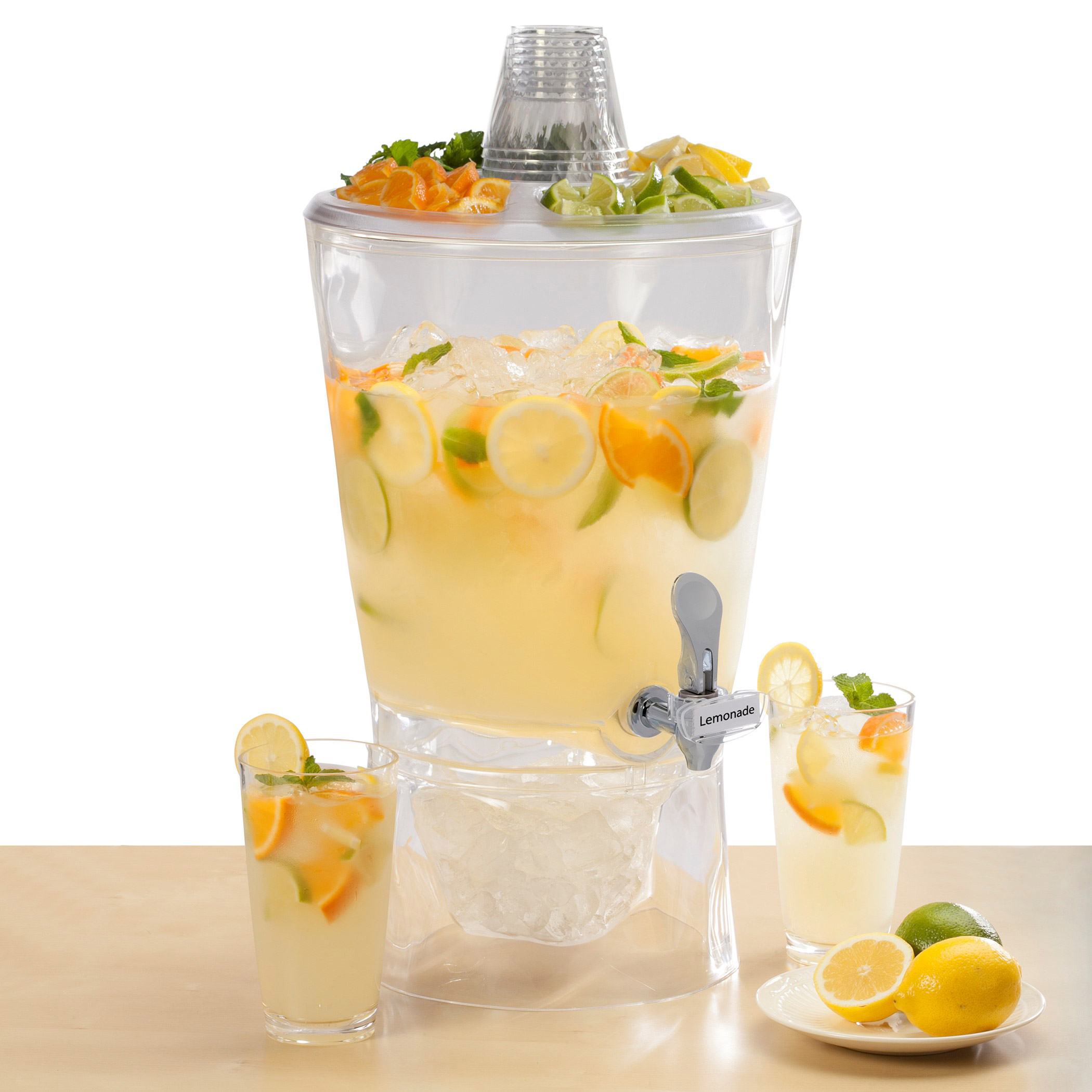 This CreativeWare 3.5 gallon beverage dispenser is a one stop serving area for your favorite beverage, garnish, and cups from one convenient location. The impact resistant beverage dispenser is designed for durability and style, and keeps your cold drinks cold with an ice compartment in the base. The lid holds garnishes and glasses, and includes two clip on name tag holders and labels, to let your guests know what beverage is being served.