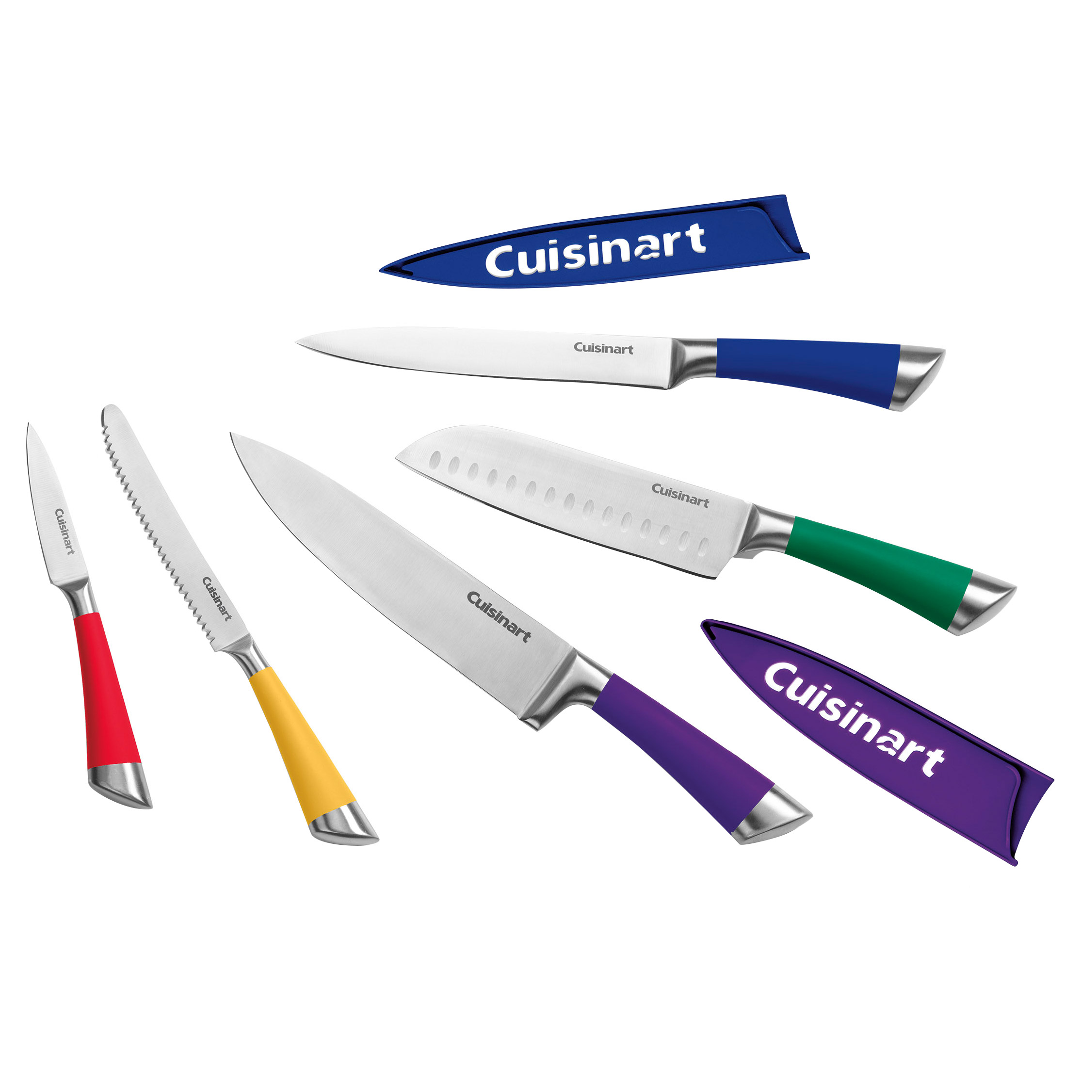 This Cuisinart 5-piece knife set combines performance and style, with colorful soft-grip handles and precision stainless steel blades. The ergonomic design makes each knife especially easy to handle, while each tapered blade is forged with a razor-sharp cutting edge for professional-caliber results. 5-Piece Set Includes: