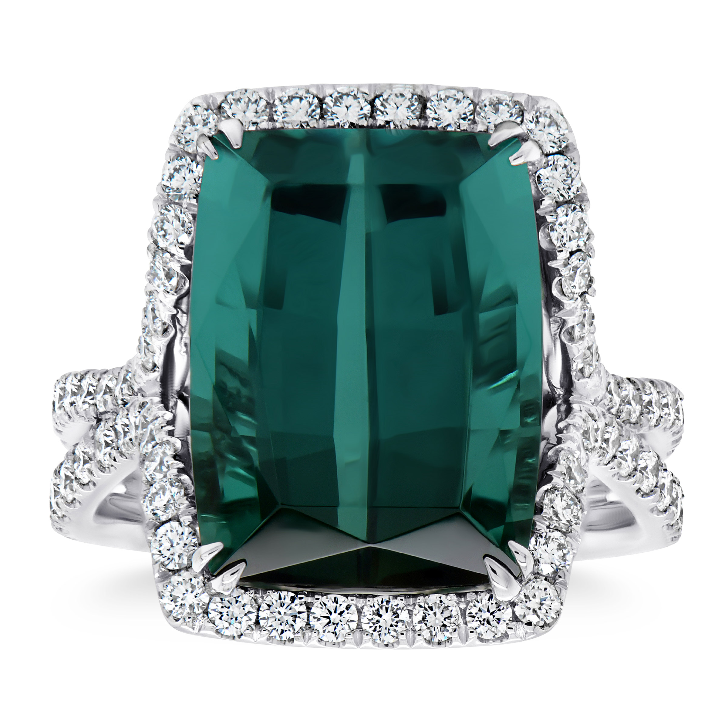 Cushion Cut 10.01 ct Greenish Blue Tourmaline & Diamond Platinum Ring