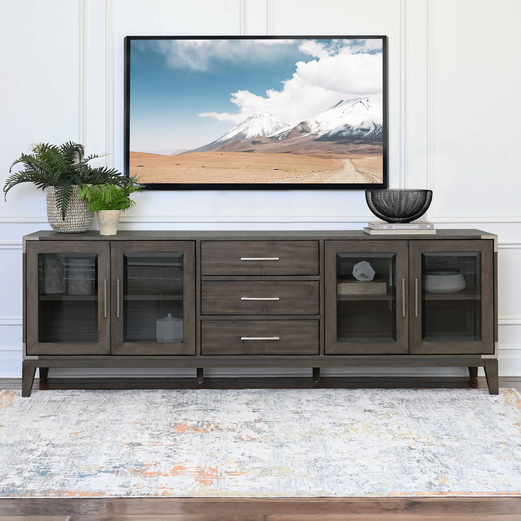The Daxton 80” Media Console by Abbyson is designed and constructed with durable rubberwood and acacia veneers, the natural, texture finish utilizes a multi-step finishing process for lasting durability. A beautiful contrast is created with the antiqued silver hardware and trim at the corners. Each unit is individually crafted with solid framing and traditional woodworking techniques. A total of three center drawers allow for ample storage. The soft-close drawers feature Hettich glides and dovetail joints for maximum durability. Daxton also features two sets of media shelves, behind the beveled, tempered glass doors, that are both adjustable and removable.