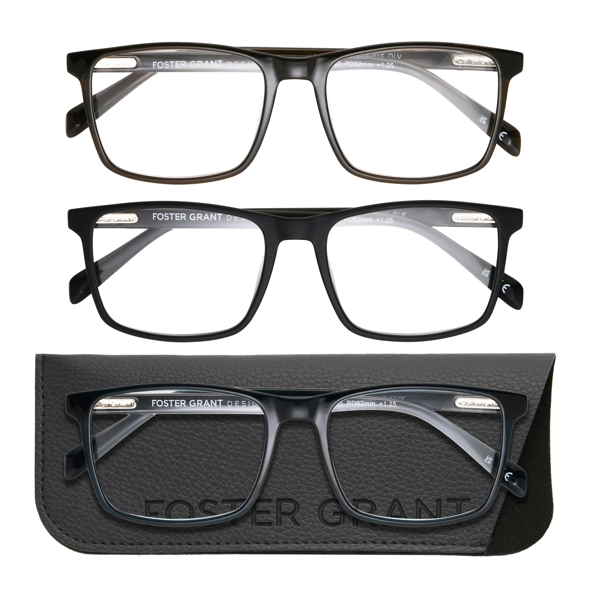 WARNING: This product can expose you to Nickel, which is known to the State of California to cause birth defects or other reproductive harm. For more information go to: www.P65Warnings.ca.gov. These square full-rim readers from Foster Grant Design Optics combine clean lines with all-day functionality.  These high quality reading glasses feature frames made from 75% recycled plastic* and lenses made from 100% recycled plastic so you can look good and feel good too. The fully magnified lenses are impact-resistant and 2x more scratch resistant** for extra durability. Hidden metal spring hinges with a subtle logo plaque and mastoid temple tips provide a comfortable, secure fit. Distortion Minimizing Lenses** Effective visibility area is increased compared to transitional spherical lens design. Includes a recycled polyester pebble grain leatherette case. *Recycled content is calculated by mass balance. **Results from steel wool testing versus prior iterations of Design Optics 3-pack readers. Independent lab certified. Features: